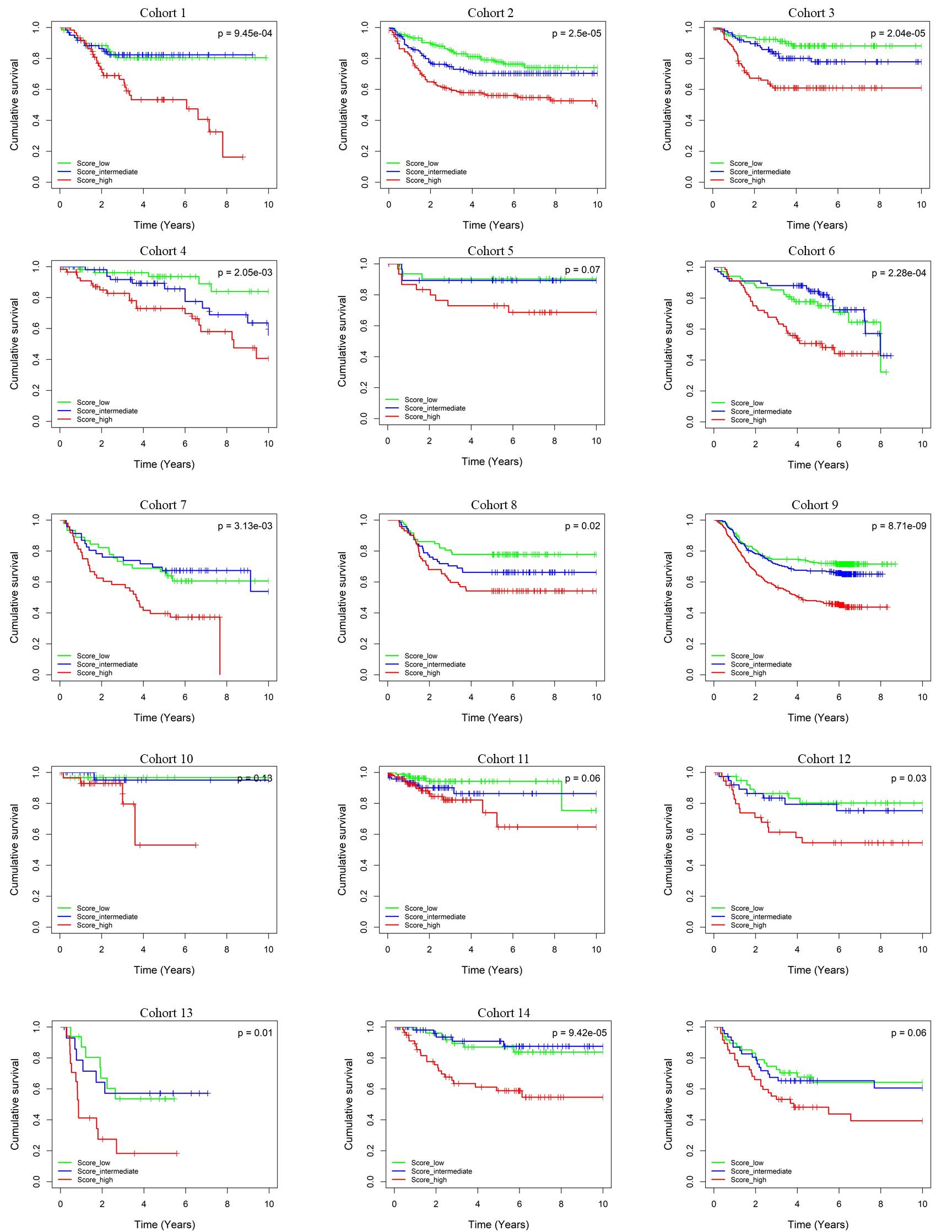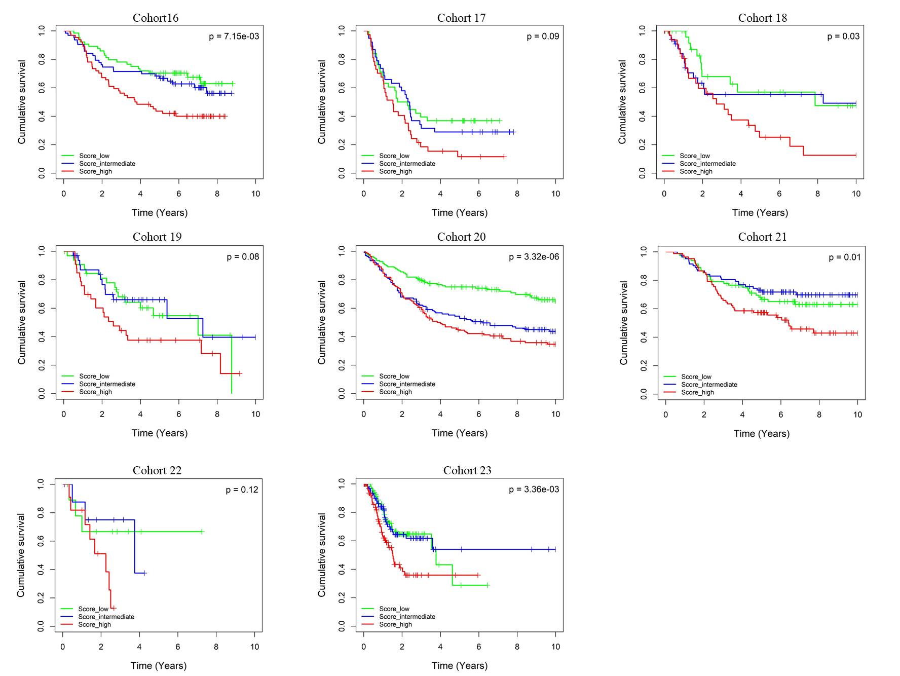 此处仅分析 2 期和 3 期癌症。每个 Kaplan-Meier 曲线图代表一个独立数据集的分析结果。