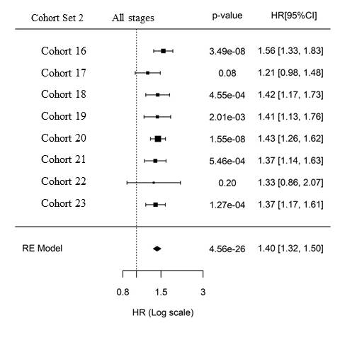 风险比(HR)以森林图形式展示。共分析了 23 个独立癌症样本数据集(n = 6,067)。在部分数据集中,肿瘤全部或主要为 2 期和 3 期。总体效应通过随机效应(RE)模型计算。