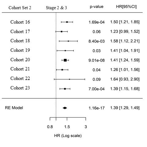 此处仅分析 2 期和 3 期癌症,风险比(HR)以森林图形式展示。