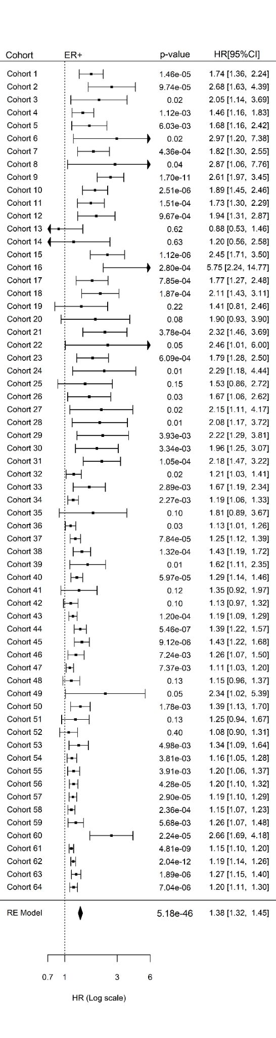 图 7. 多基因标签 Blue_panBC 预后评分与 ER 阳性乳腺癌患者生存的关联。Cox 回归分析基于 64 个独立乳腺癌队列进行。