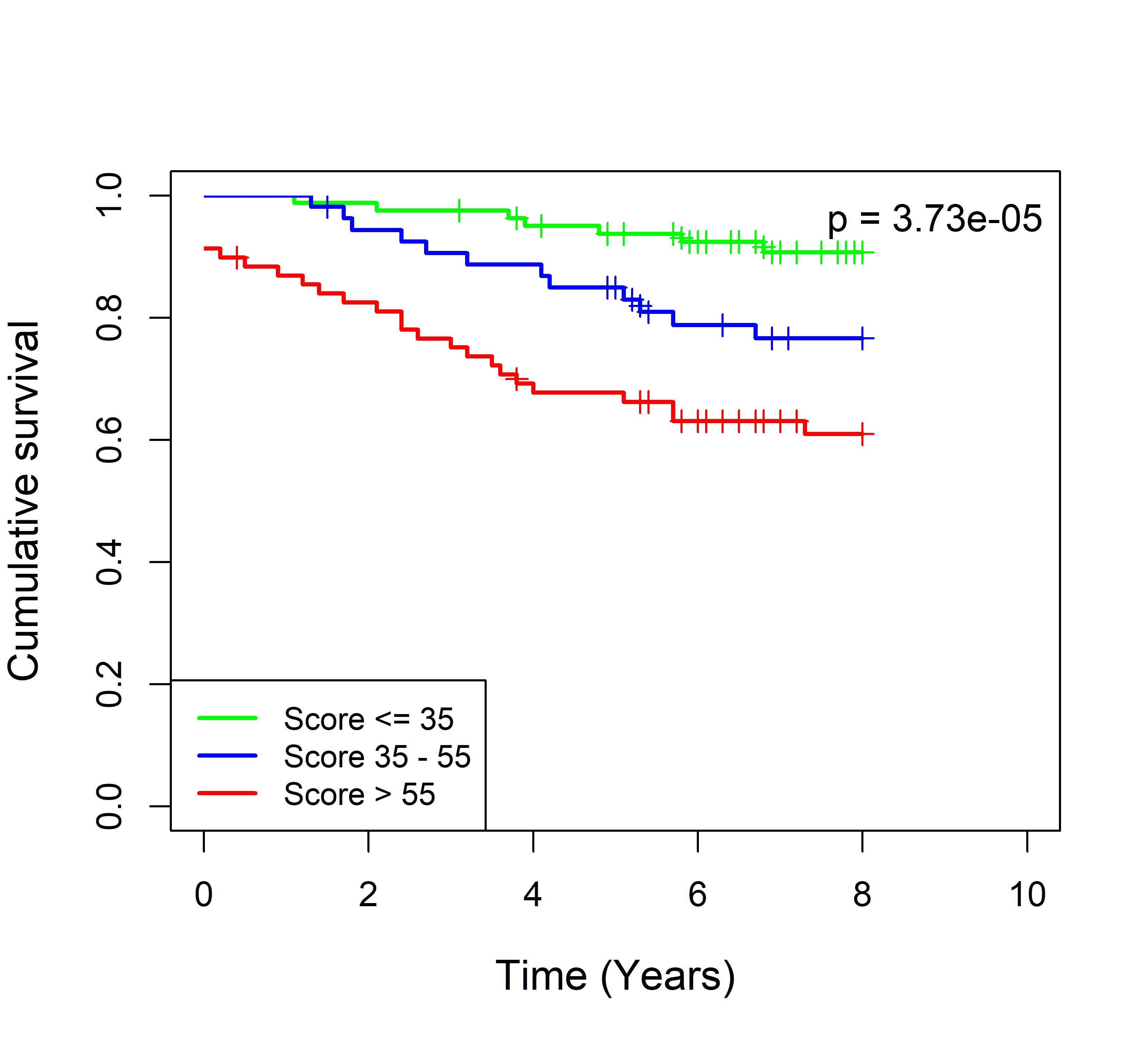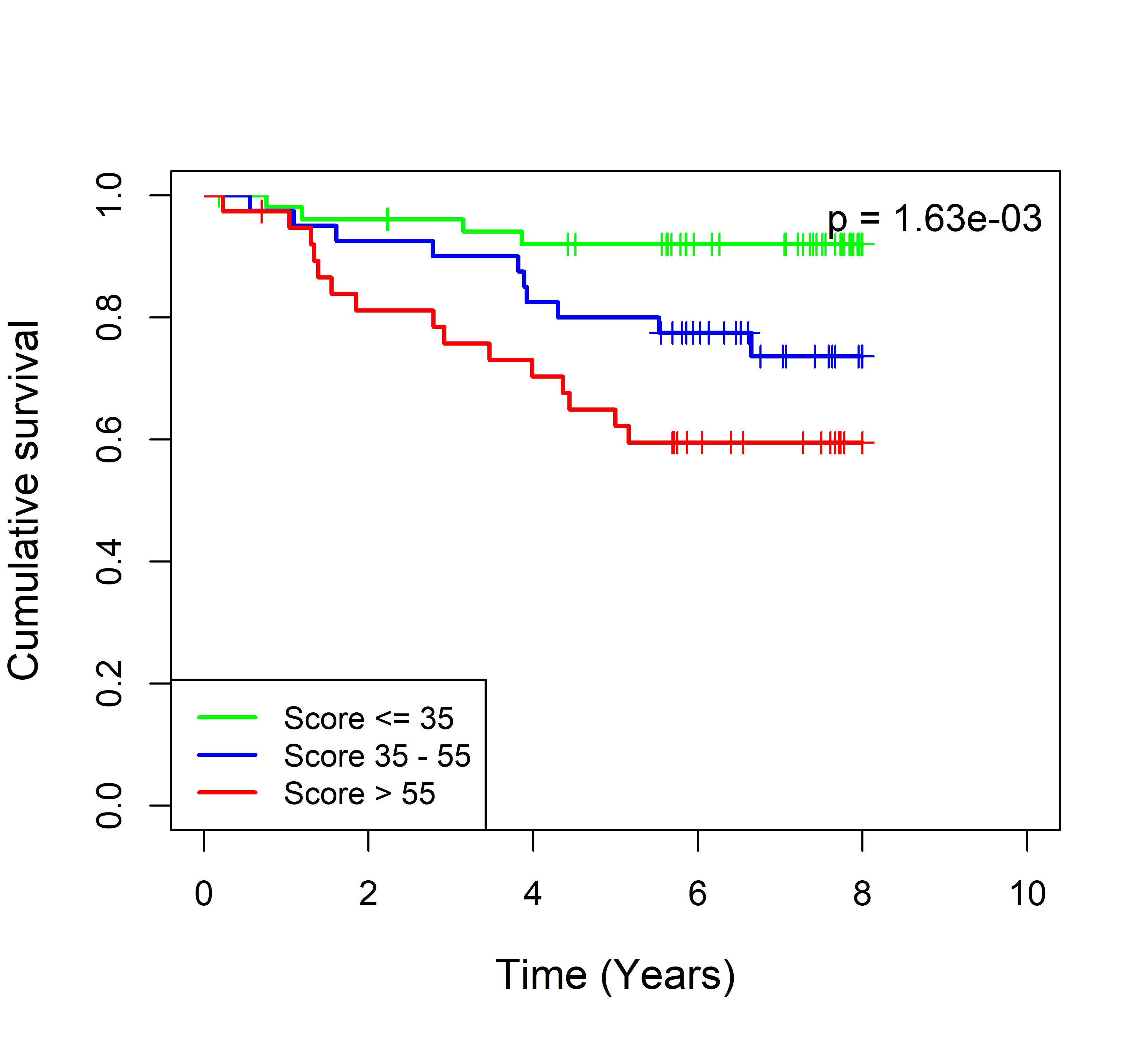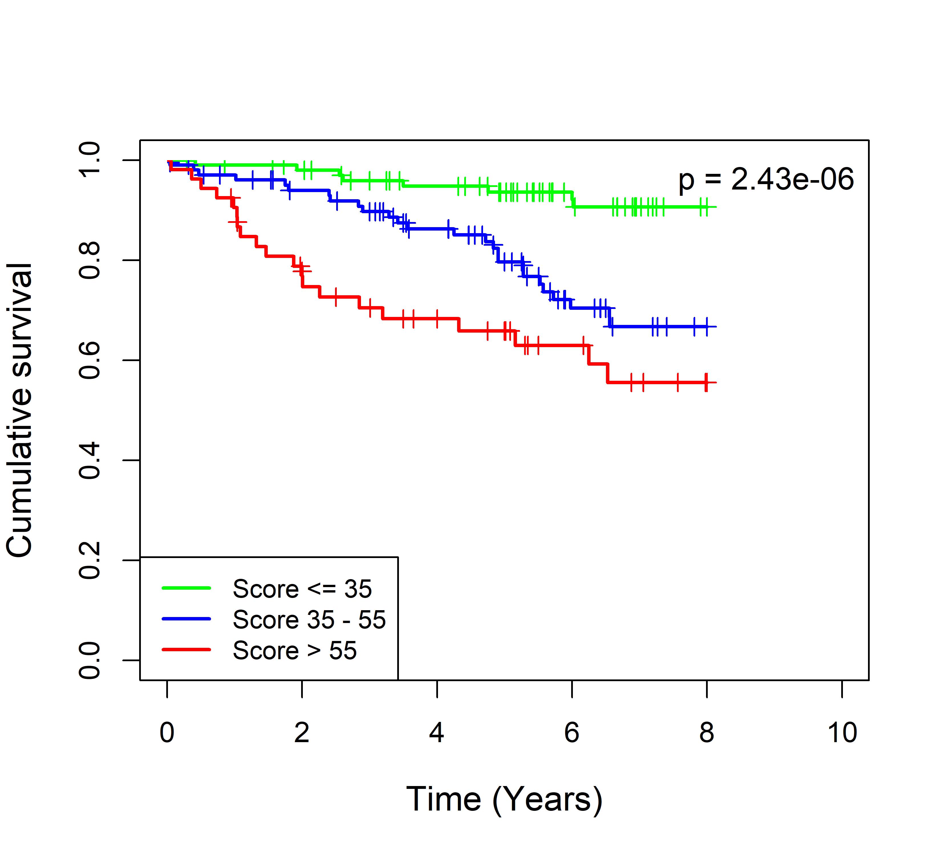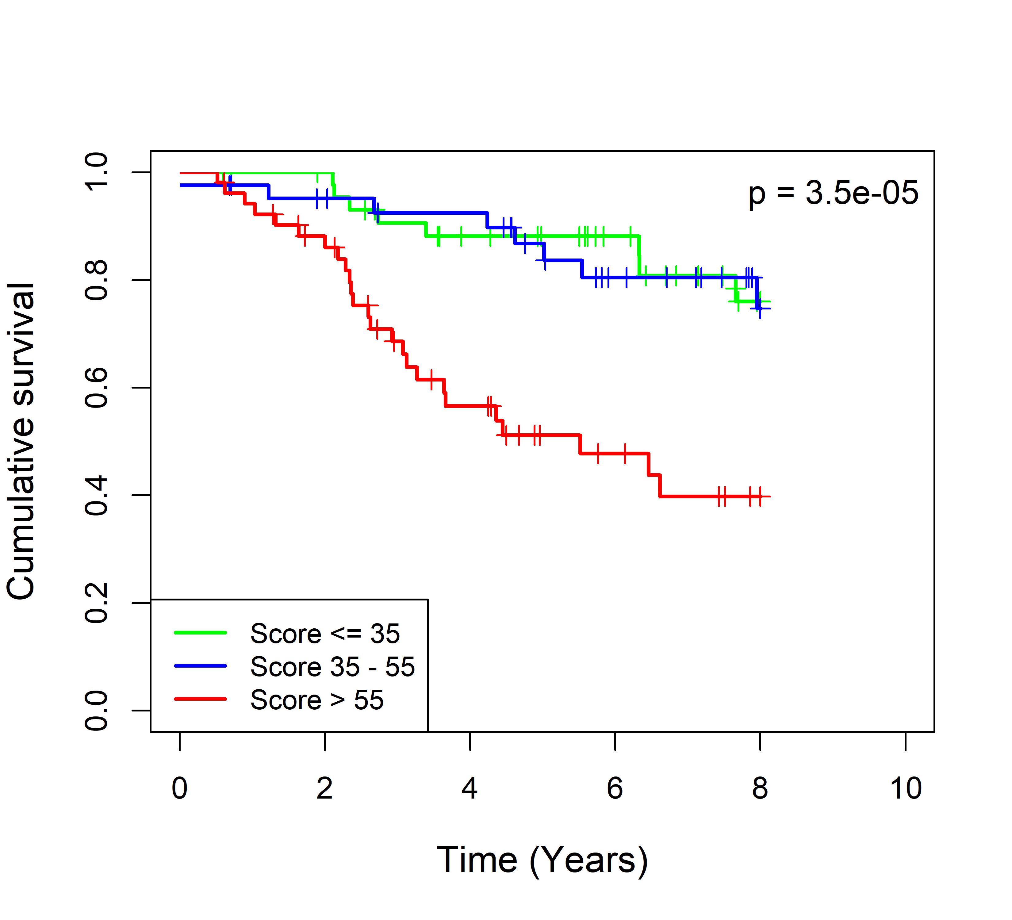 图 8. 多基因标签 Blue_panBC 预后评分与 31 个基于 TMO 的 ER 阳性乳腺癌队列患者生存的关联。每个 Kaplan-Meier 曲线图代表一个独立队列的分析结果。我们开发了一种算法,可独立于队列整体数据计算多基因标签 Blue_panBC 的预后评分,从而实现不同 TMO 芯片平台间乳腺癌样本评分的直接比较,并可对新增个体样本计算该标签的预后评分。所有样本根据预后评分分为三组:低(≤35)、中(35–55)和高(>55)。随后对这些组别的累积生存率进行比较。33 个非 TMO ER 阳性乳腺癌队列的数据见图 9。