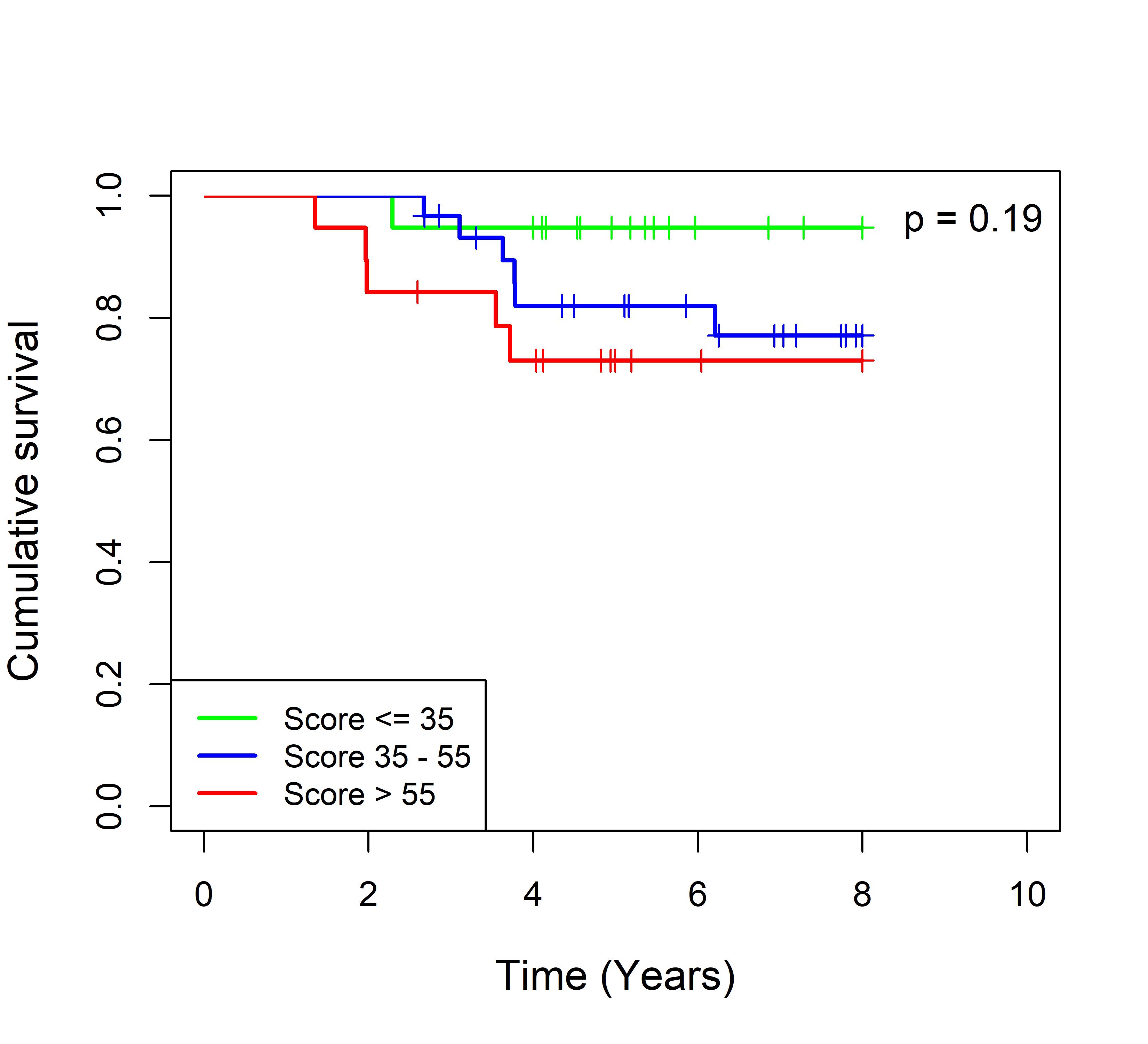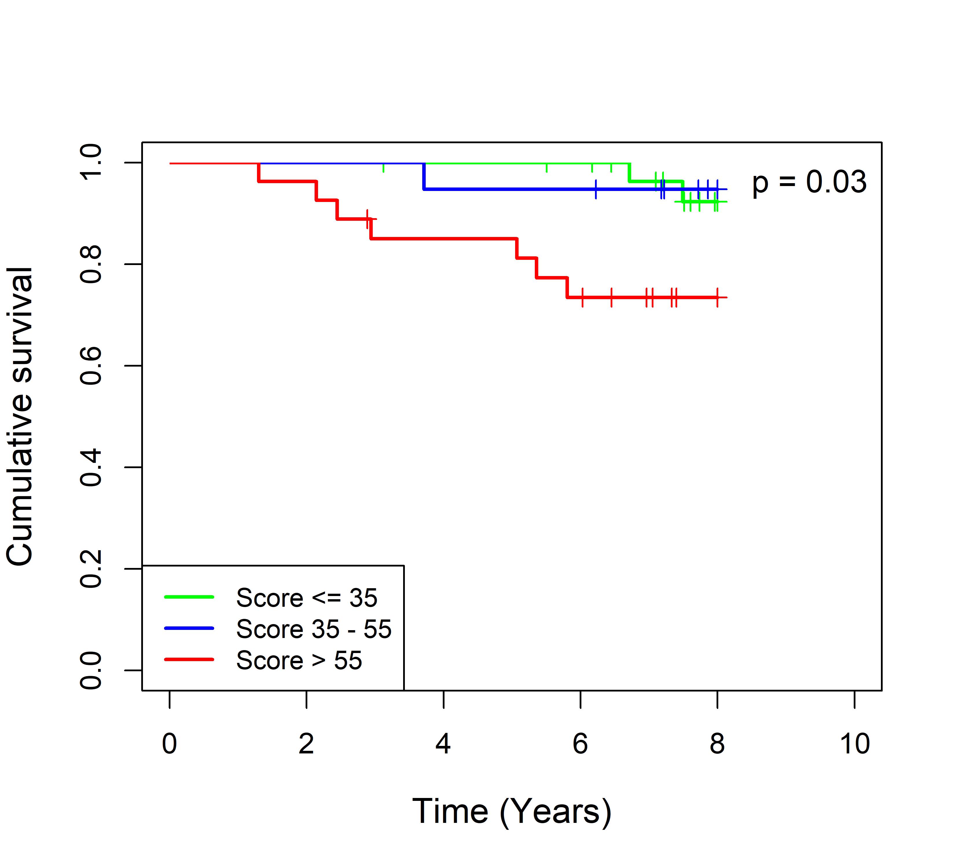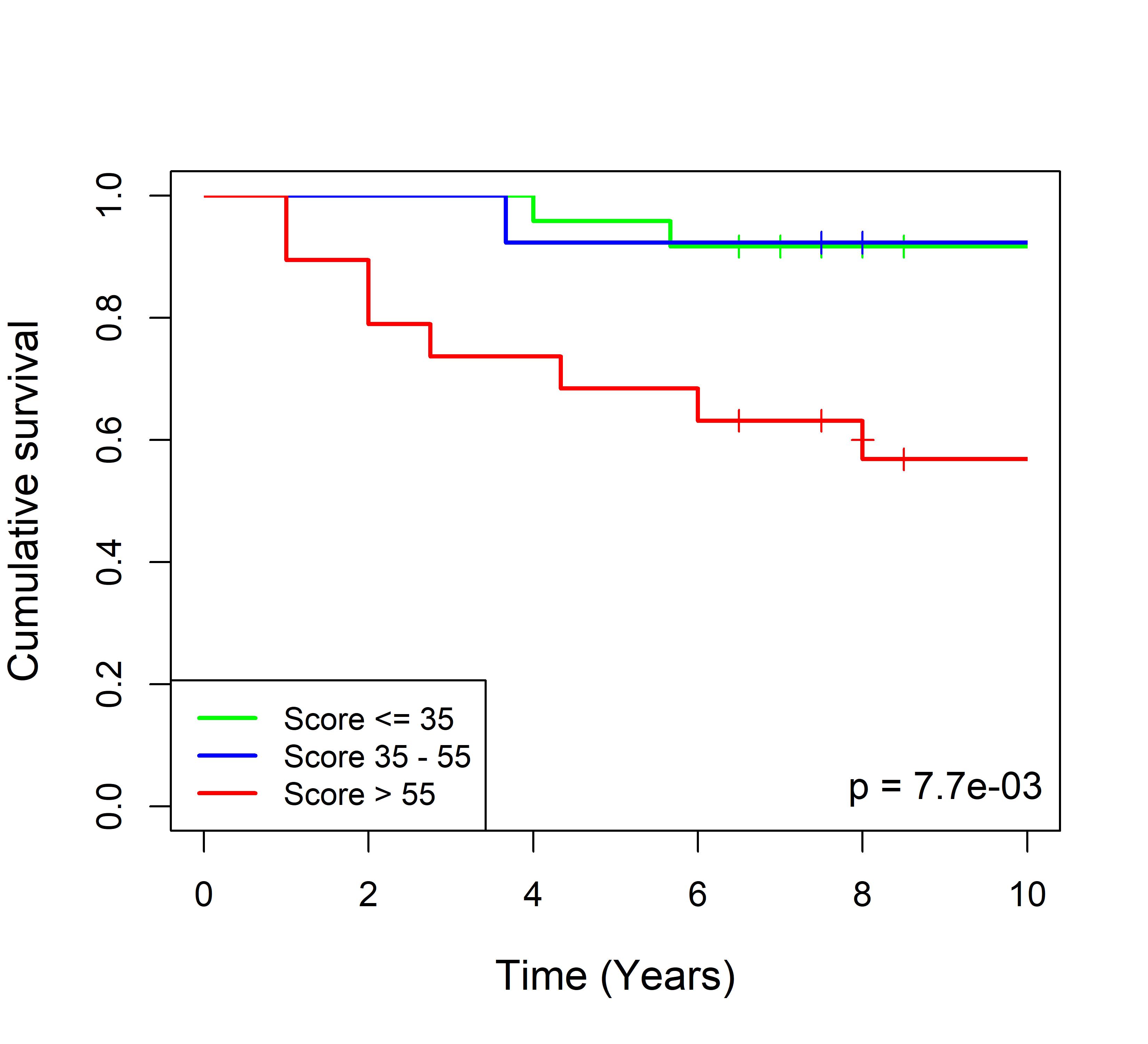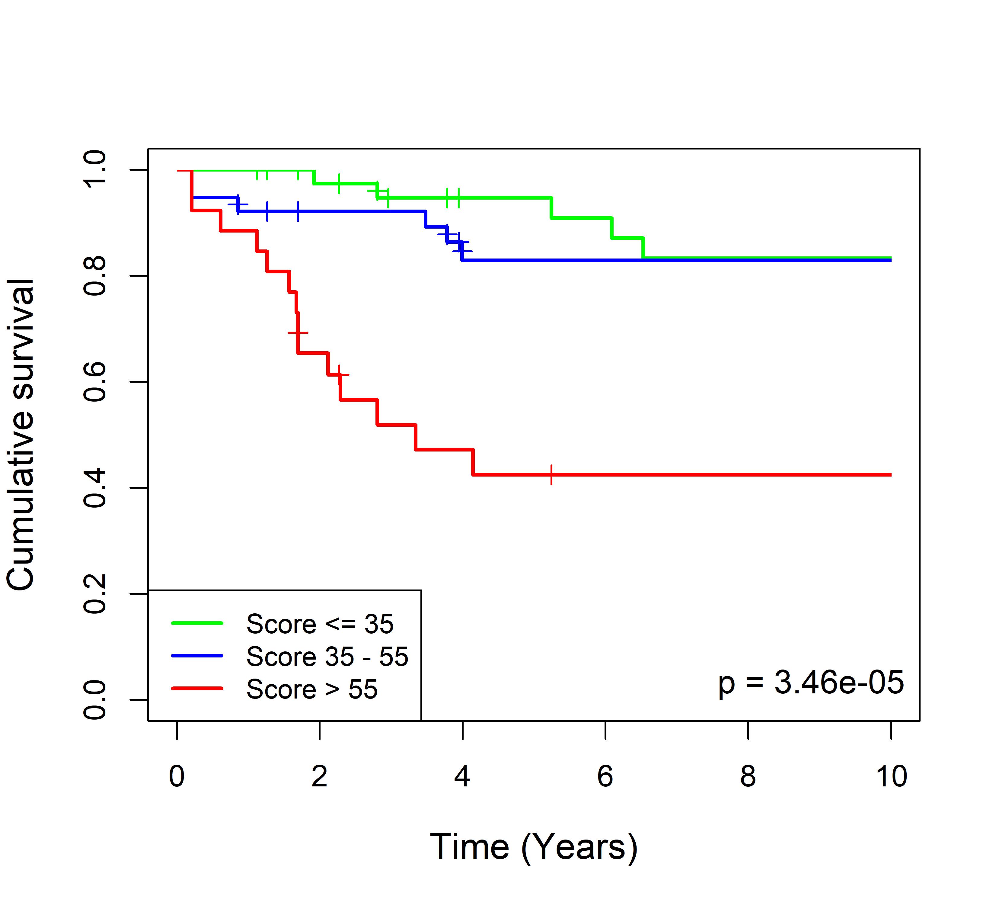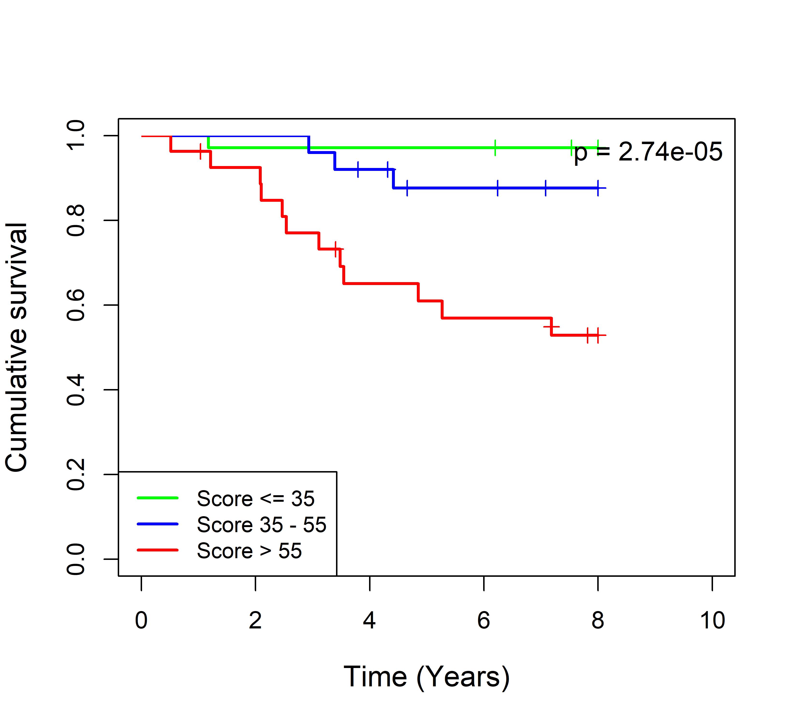 图 8. 多基因标签 Blue_panBC 预后评分与 31 个基于 TMO 的 ER 阳性乳腺癌队列患者生存的关联。每个 Kaplan-Meier 曲线图代表一个独立队列的分析结果。我们开发了一种算法,可独立于队列整体数据计算多基因标签 Blue_panBC 的预后评分,从而实现不同 TMO 芯片平台间乳腺癌样本评分的直接比较,并可对新增个体样本计算该标签的预后评分。所有样本根据预后评分分为三组:低(≤35)、中(35–55)和高(>55)。随后对这些组别的累积生存率进行比较。33 个非 TMO ER 阳性乳腺癌队列的数据见图 9。