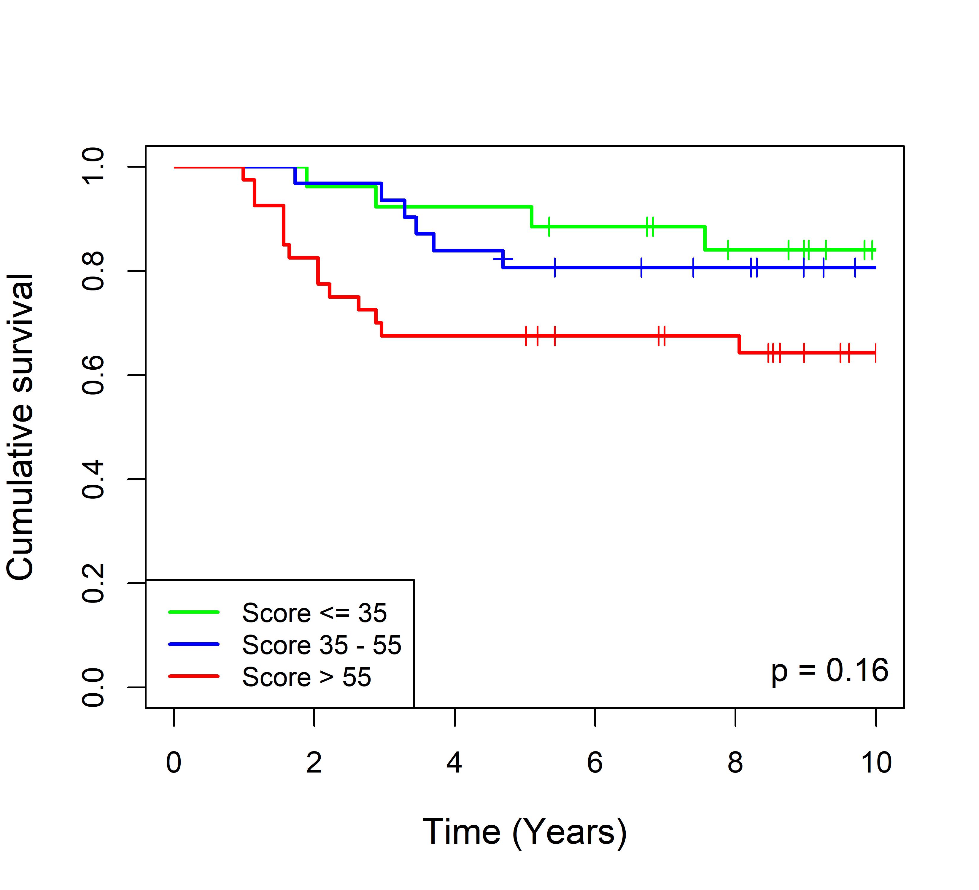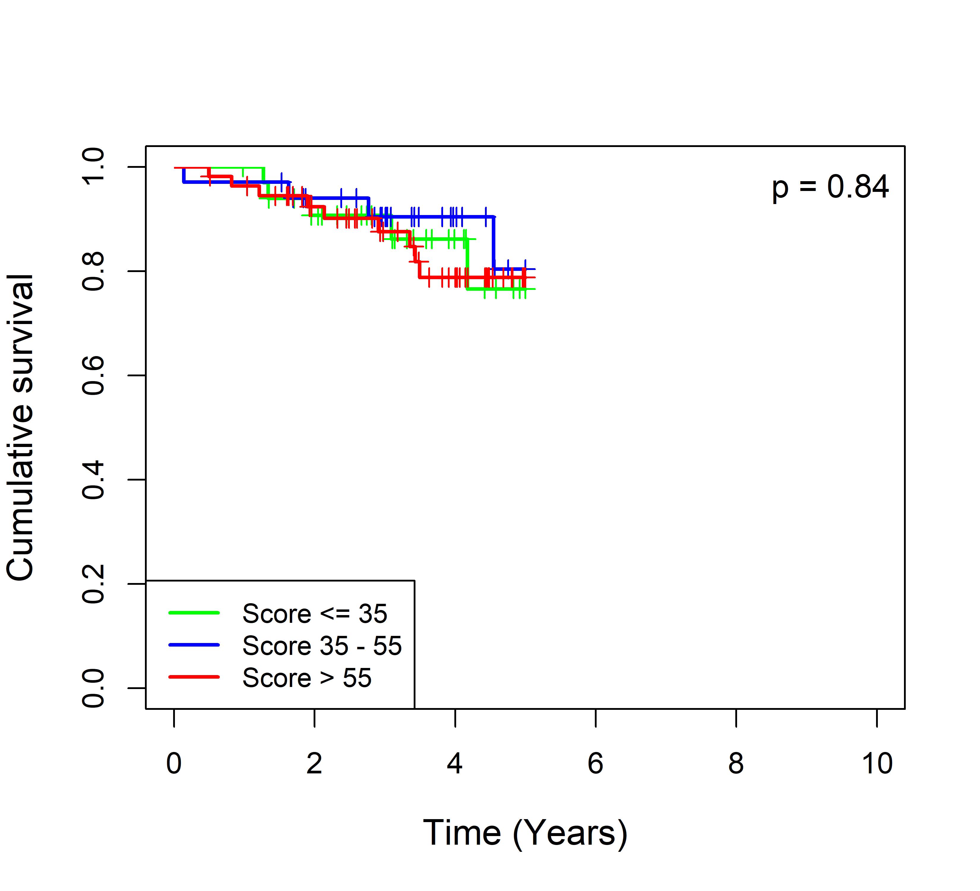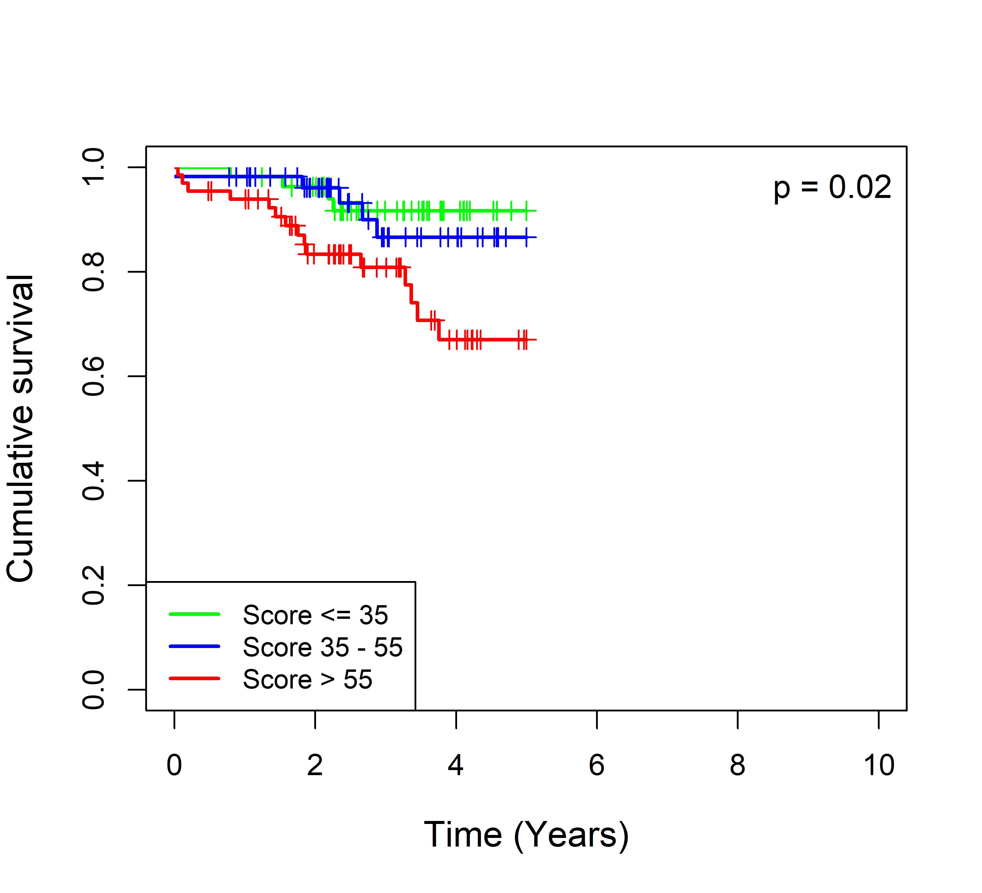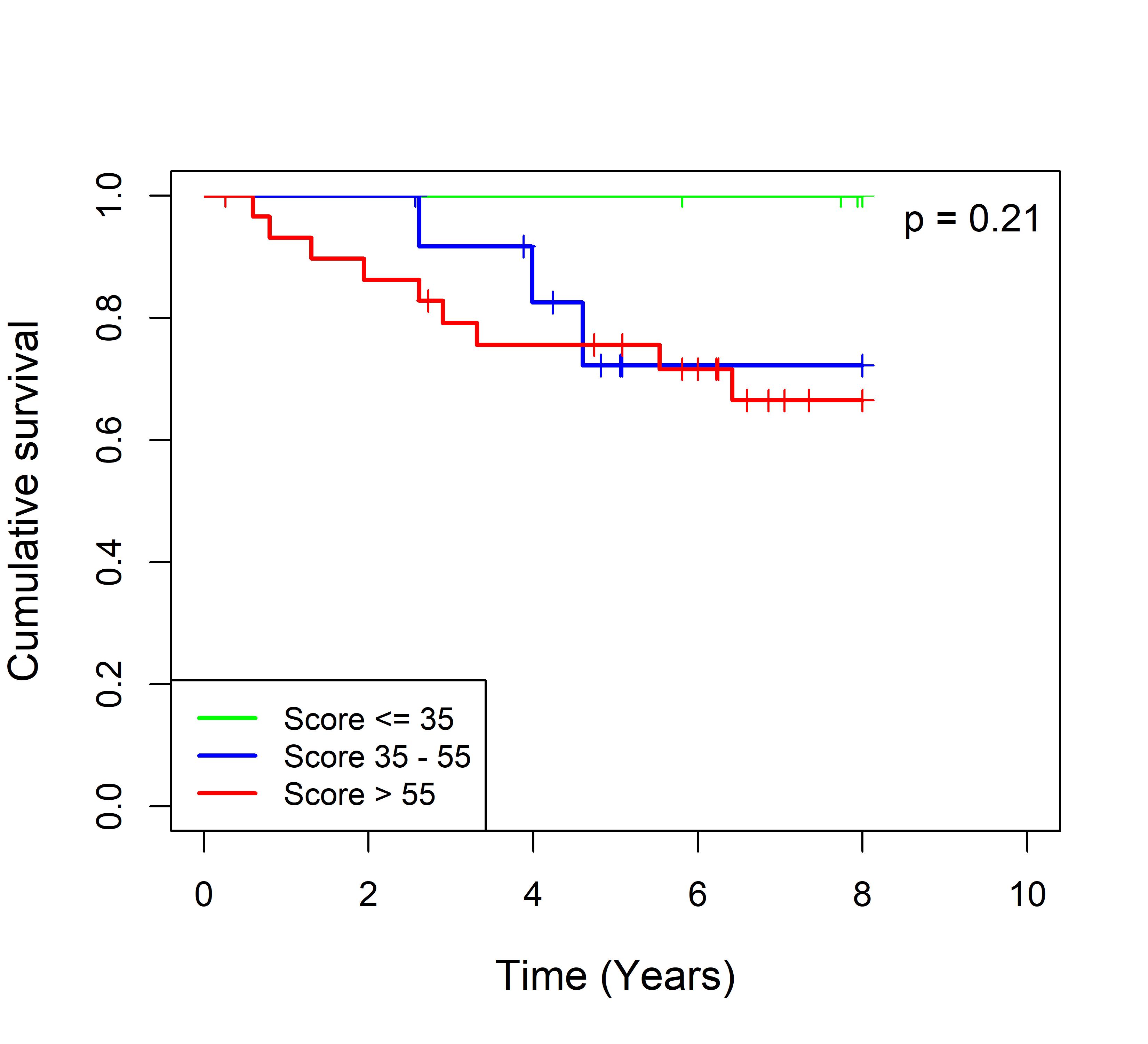 图 8. 多基因标签 Blue_panBC 预后评分与 31 个基于 TMO 的 ER 阳性乳腺癌队列患者生存的关联。每个 Kaplan-Meier 曲线图代表一个独立队列的分析结果。我们开发了一种算法,可独立于队列整体数据计算多基因标签 Blue_panBC 的预后评分,从而实现不同 TMO 芯片平台间乳腺癌样本评分的直接比较,并可对新增个体样本计算该标签的预后评分。所有样本根据预后评分分为三组:低(≤35)、中(35–55)和高(>55)。随后对这些组别的累积生存率进行比较。33 个非 TMO ER 阳性乳腺癌队列的数据见图 9。