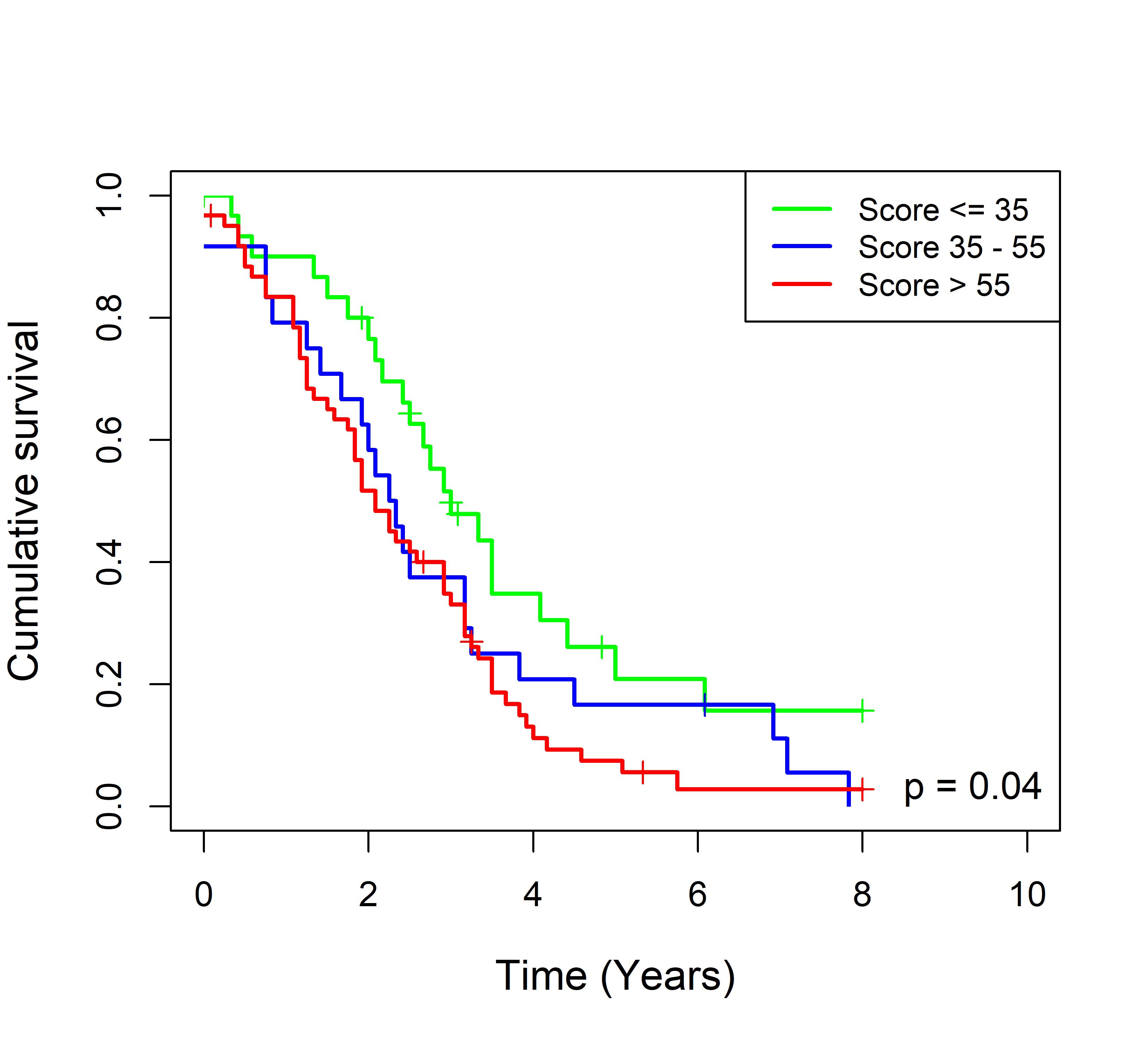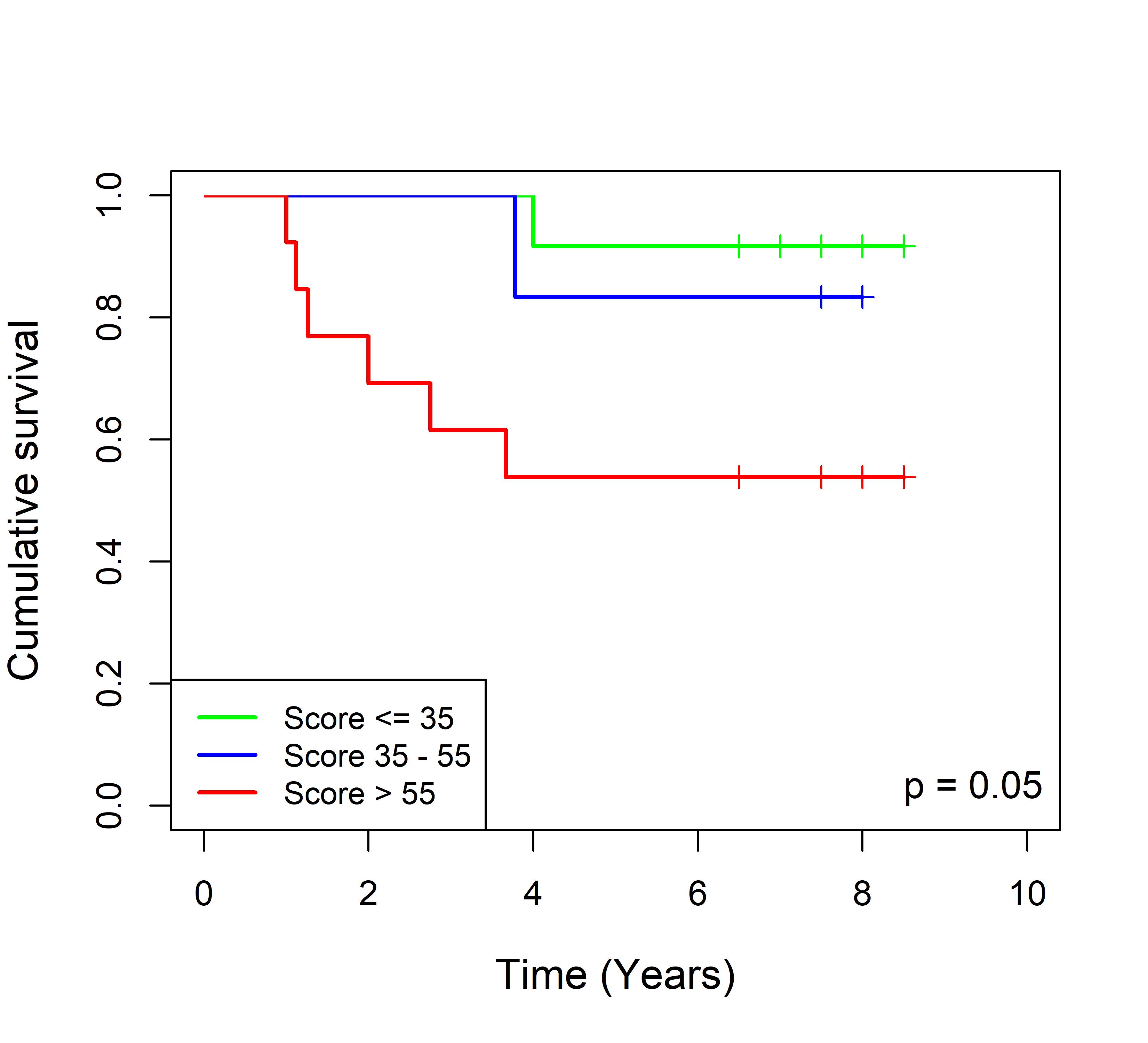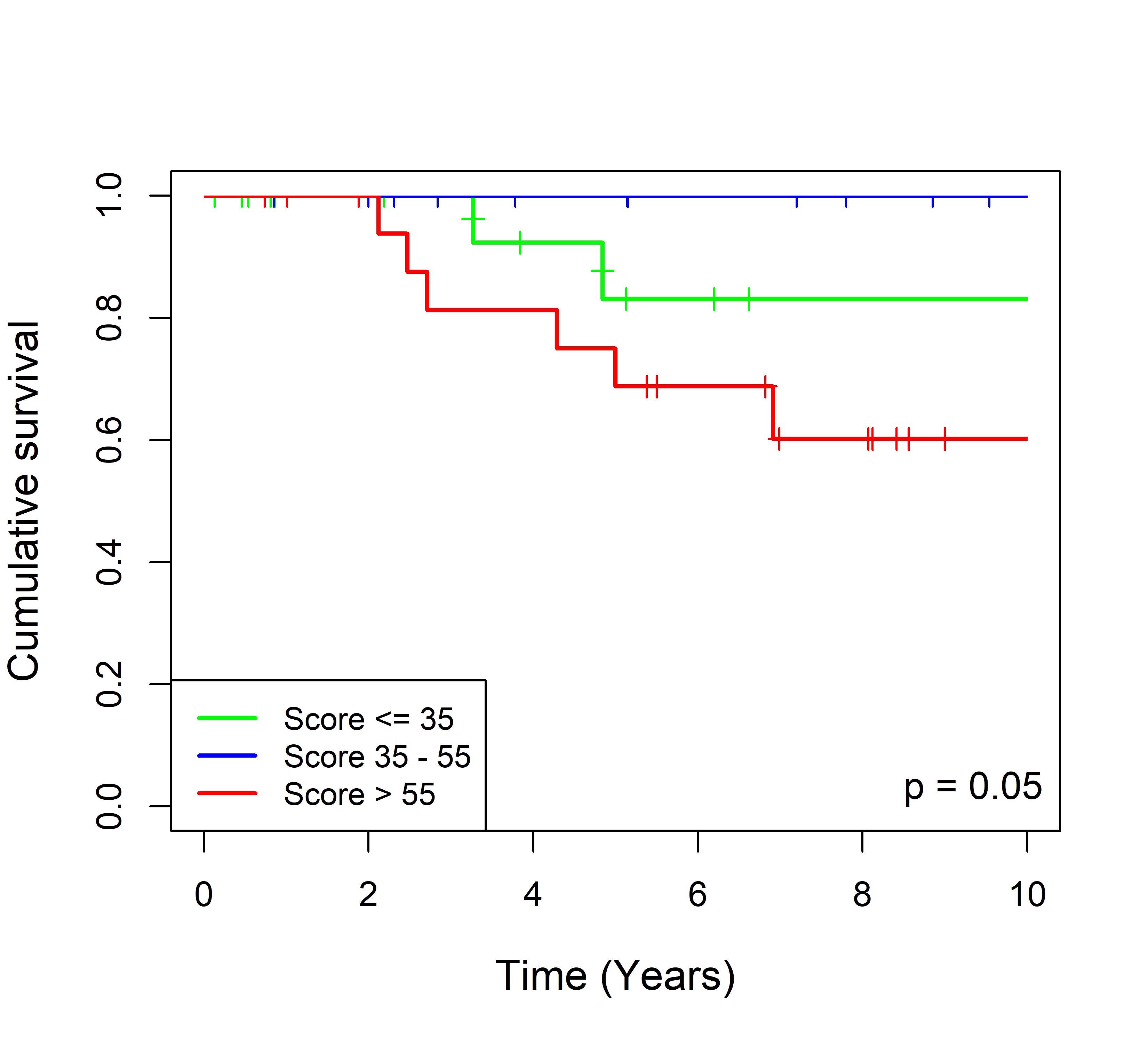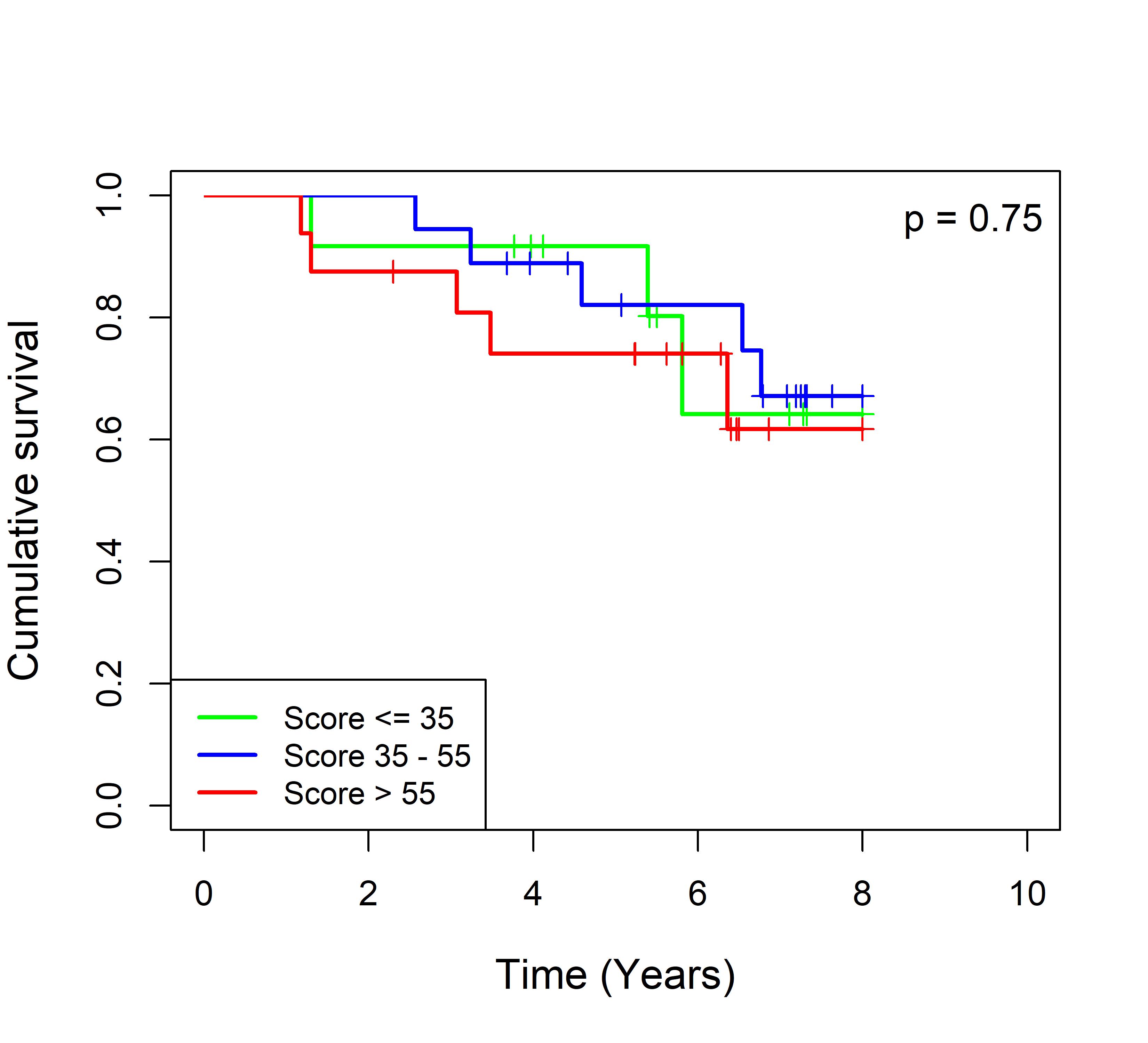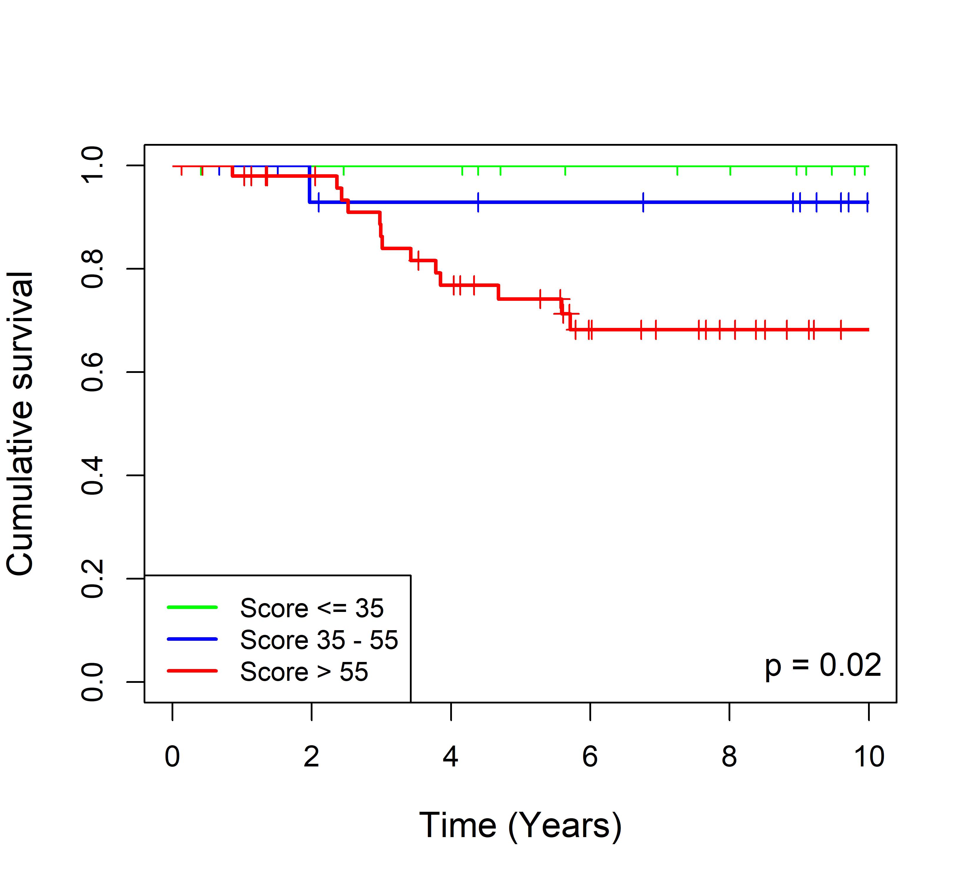 图 8. 多基因标签 Blue_panBC 预后评分与 31 个基于 TMO 的 ER 阳性乳腺癌队列患者生存的关联。每个 Kaplan-Meier 曲线图代表一个独立队列的分析结果。我们开发了一种算法,可独立于队列整体数据计算多基因标签 Blue_panBC 的预后评分,从而实现不同 TMO 芯片平台间乳腺癌样本评分的直接比较,并可对新增个体样本计算该标签的预后评分。所有样本根据预后评分分为三组:低(≤35)、中(35–55)和高(>55)。随后对这些组别的累积生存率进行比较。33 个非 TMO ER 阳性乳腺癌队列的数据见图 9。