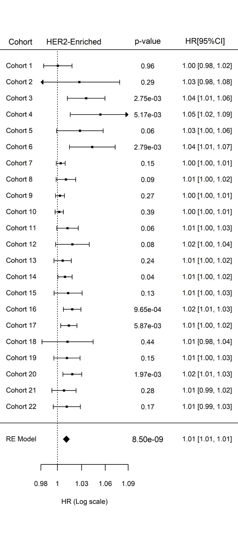 图 7. Blue_TNBC 分数与 HER2-Enriched 型乳腺癌患者生存相关性的 Cox 回归分析(22 个独立队列)。由于研究队列中 ER-/HER2+ 型乳腺癌病例数量有限,Blue_TNBC 对生存的预测性能改在 HER2-Enriched 型乳腺癌中进行评估。HER2-Enriched 亚型通过 R 软件包 genefu 进行定义。