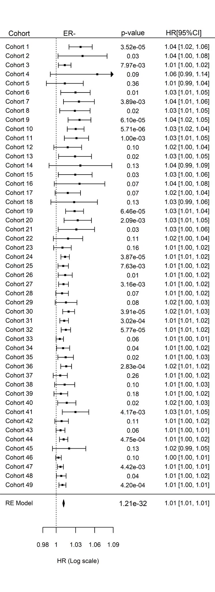 图 4. 多基因标签 Blue_TNBC 预后评分与 ER 阴性乳腺癌患者生存的关联。Cox 回归分析基于 49 个独立队列进行。