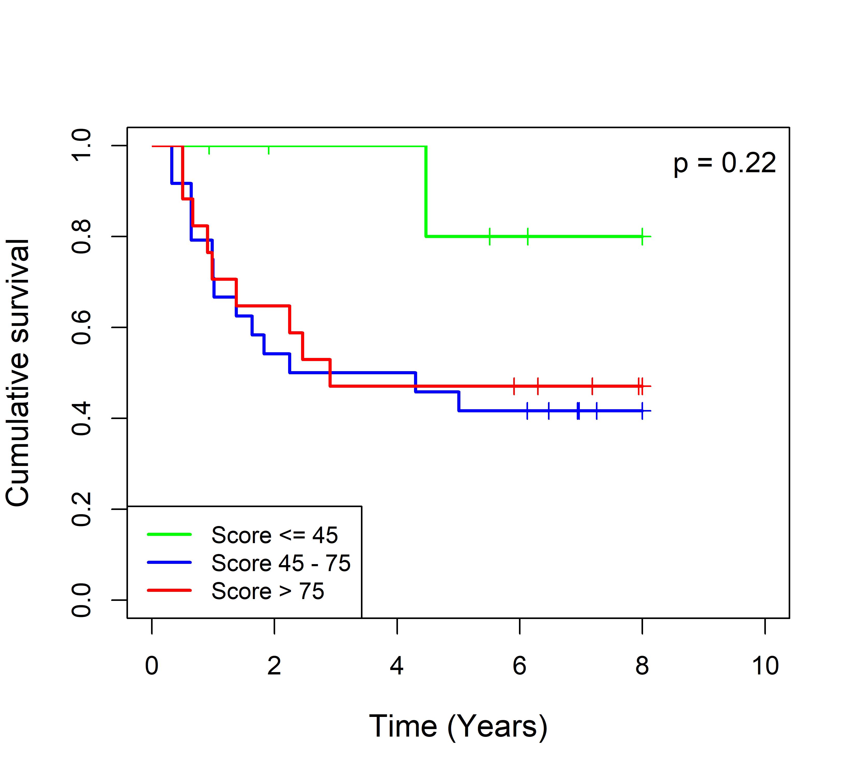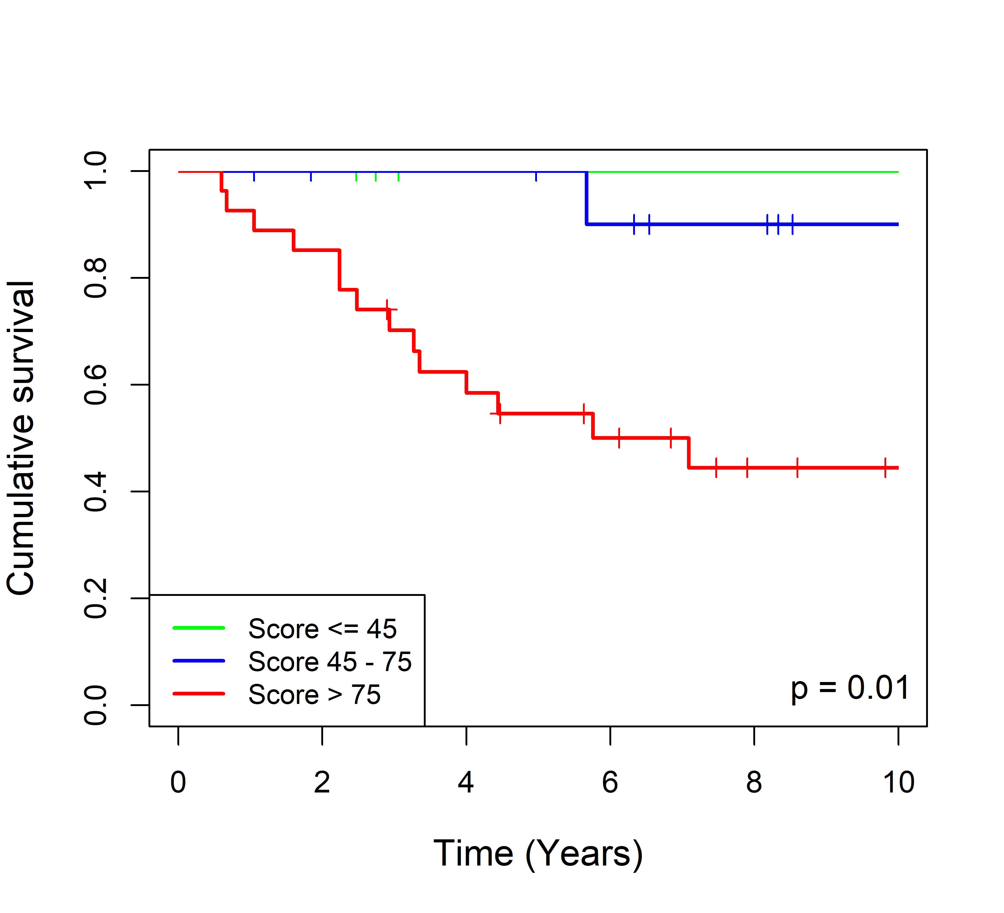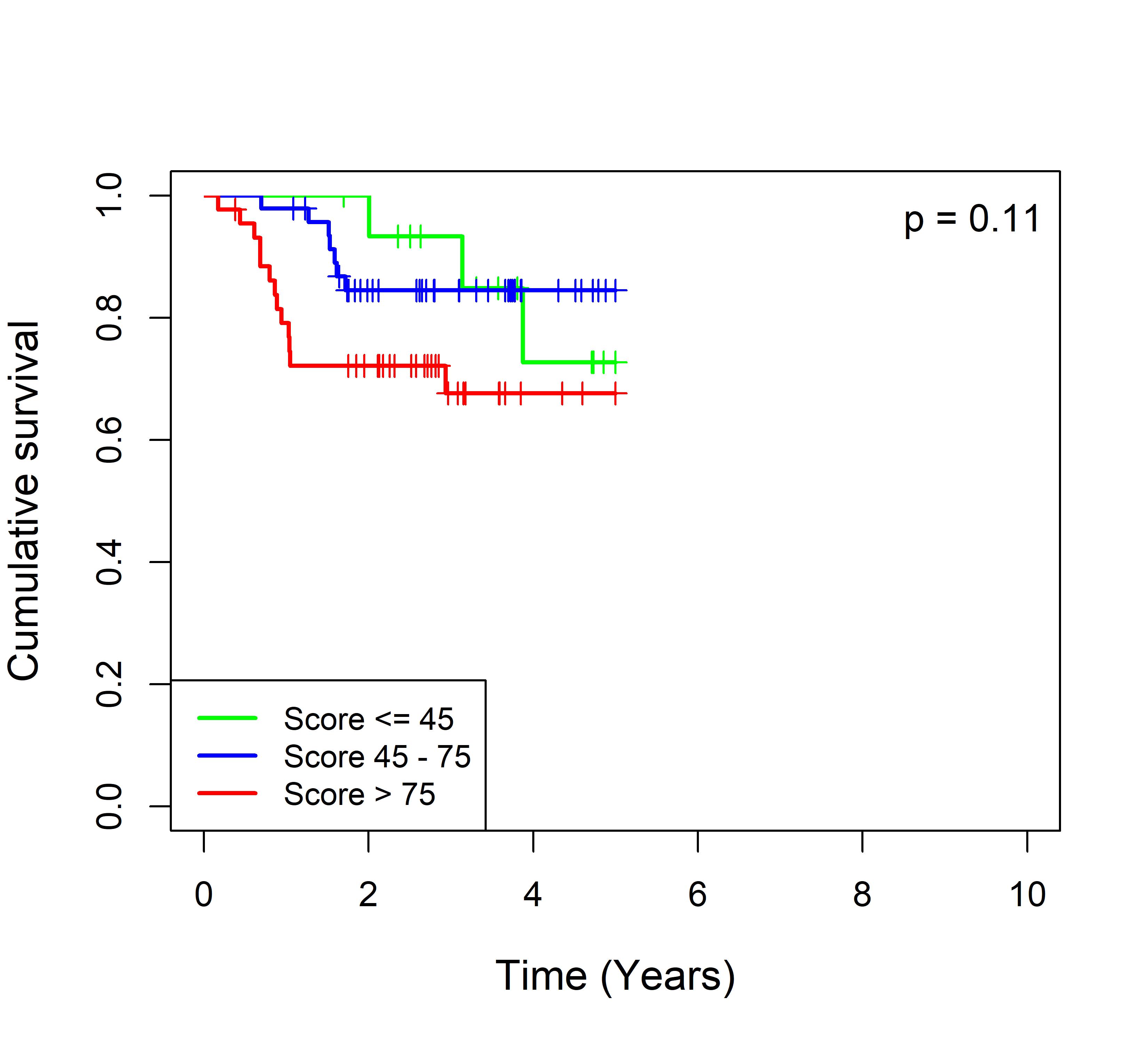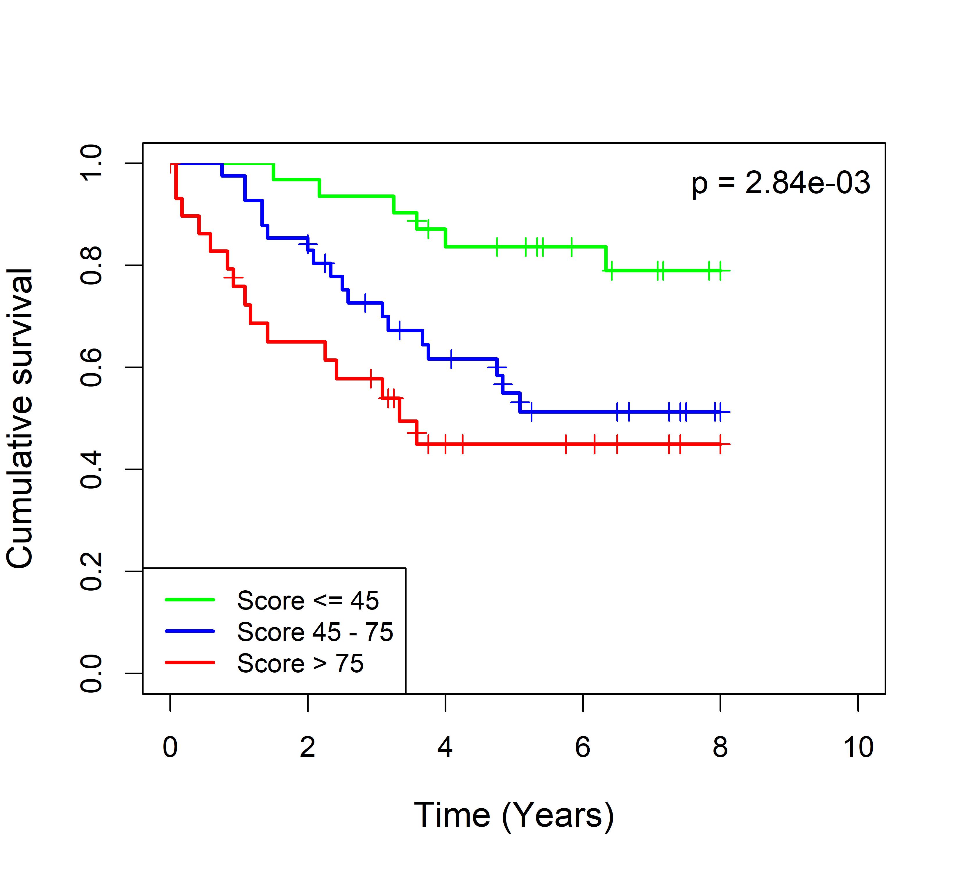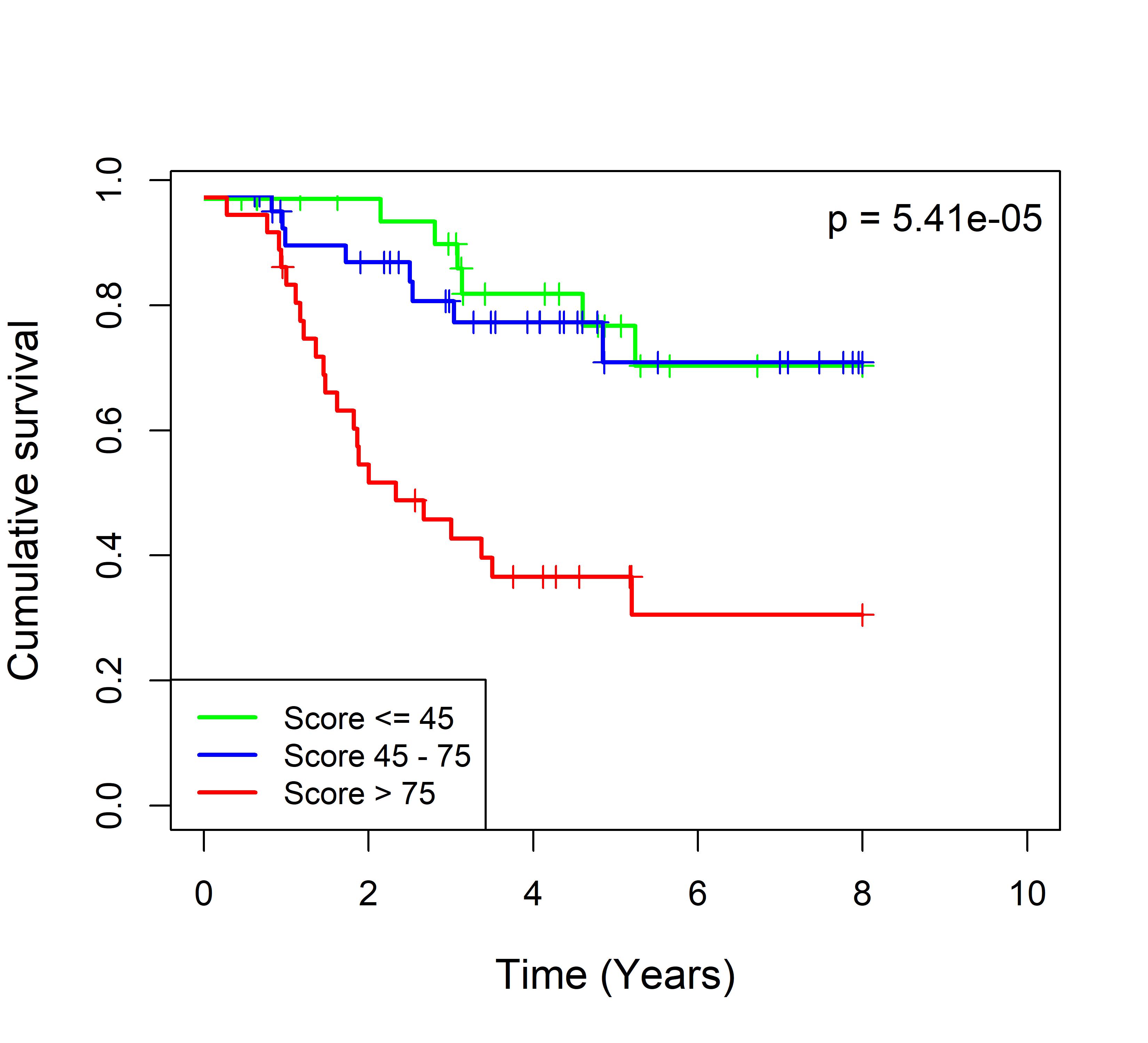 图 2. 多基因标签 Blue_panBC 预后评分与 22 个基于 TMO 的 ER 阴性乳腺癌队列患者生存的关联。每个 Kaplan-Meier 曲线图代表一个独立队列的分析结果。我们开发了一种算法,可独立于队列整体数据计算多基因标签 Blue_panBC 的预后评分,从而实现不同 TMO 芯片平台间乳腺癌样本评分的直接比较,并可对新增个体样本计算该标签的预后评分。所有样本根据预后评分分为三组:低(≤45)、中(45–75)和高(>75)。随后对这些组别的累积生存率进行比较。27 个非 TMO 乳腺癌队列的数据见图 3。
