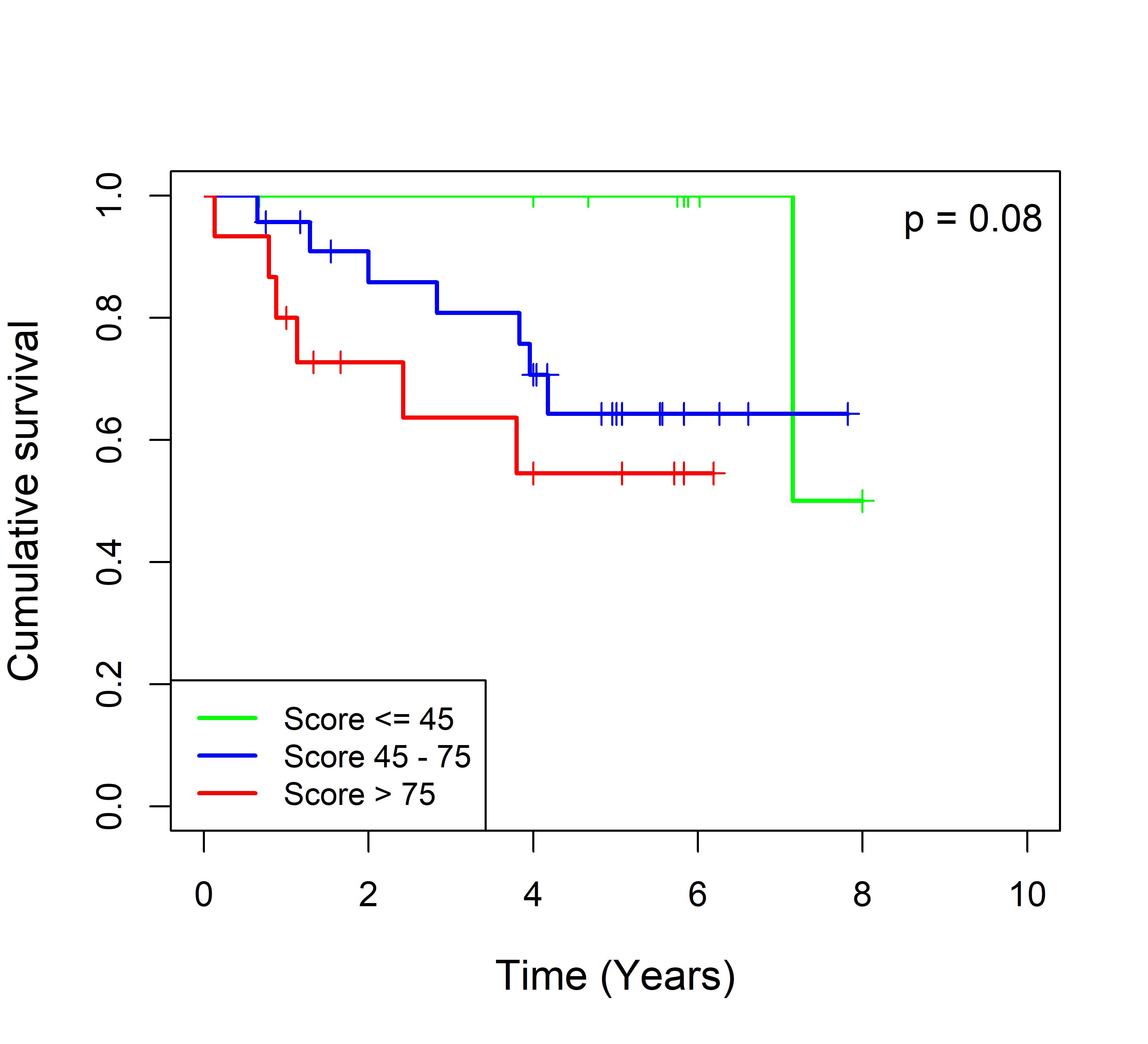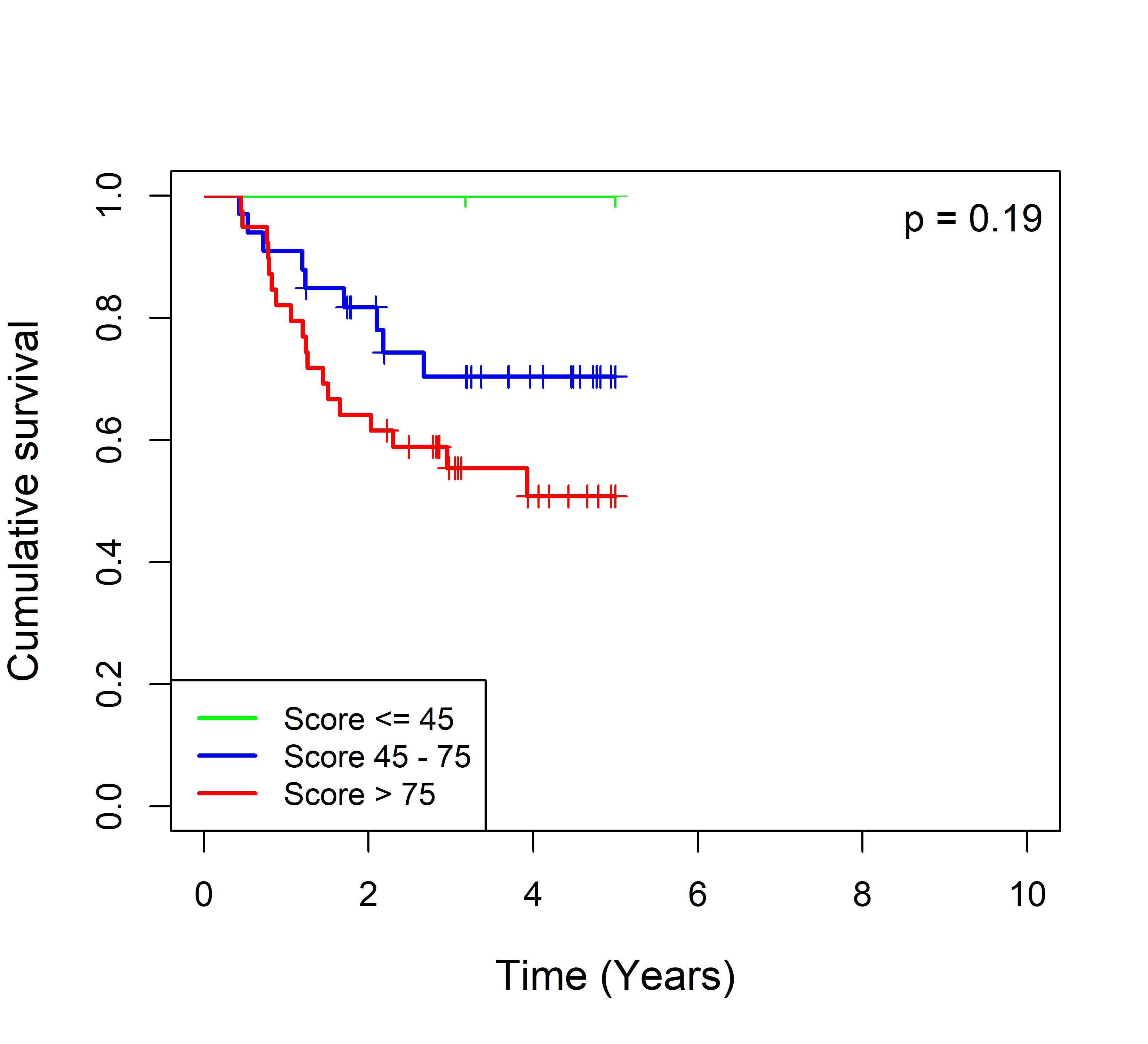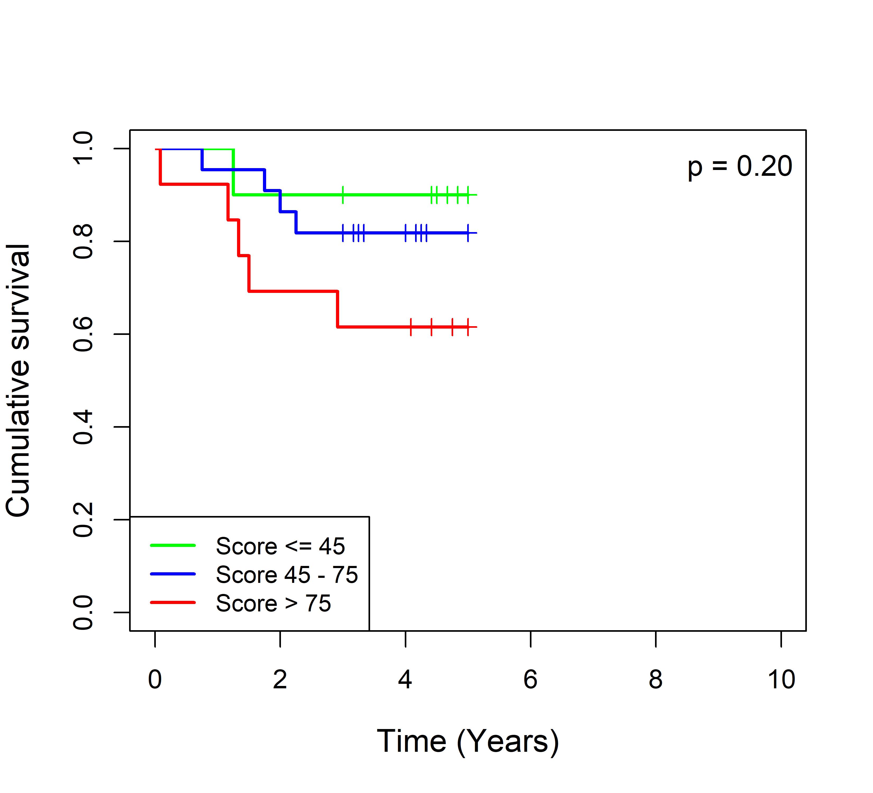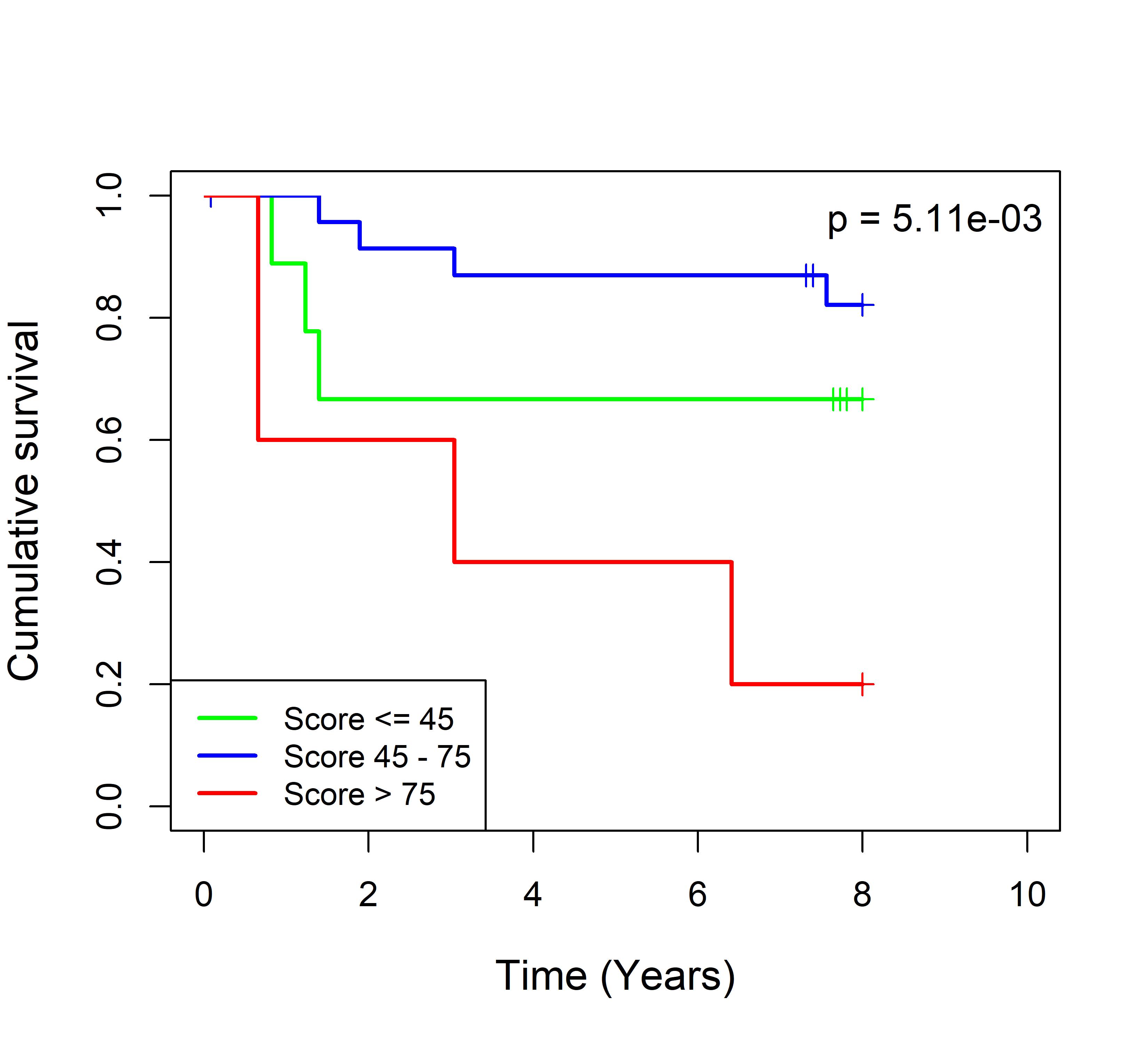 图 2. 多基因标签 Blue_panBC 预后评分与 22 个基于 TMO 的 ER 阴性乳腺癌队列患者生存的关联。每个 Kaplan-Meier 曲线图代表一个独立队列的分析结果。我们开发了一种算法,可独立于队列整体数据计算多基因标签 Blue_panBC 的预后评分,从而实现不同 TMO 芯片平台间乳腺癌样本评分的直接比较,并可对新增个体样本计算该标签的预后评分。所有样本根据预后评分分为三组:低(≤45)、中(45–75)和高(>75)。随后对这些组别的累积生存率进行比较。27 个非 TMO 乳腺癌队列的数据见图 3。