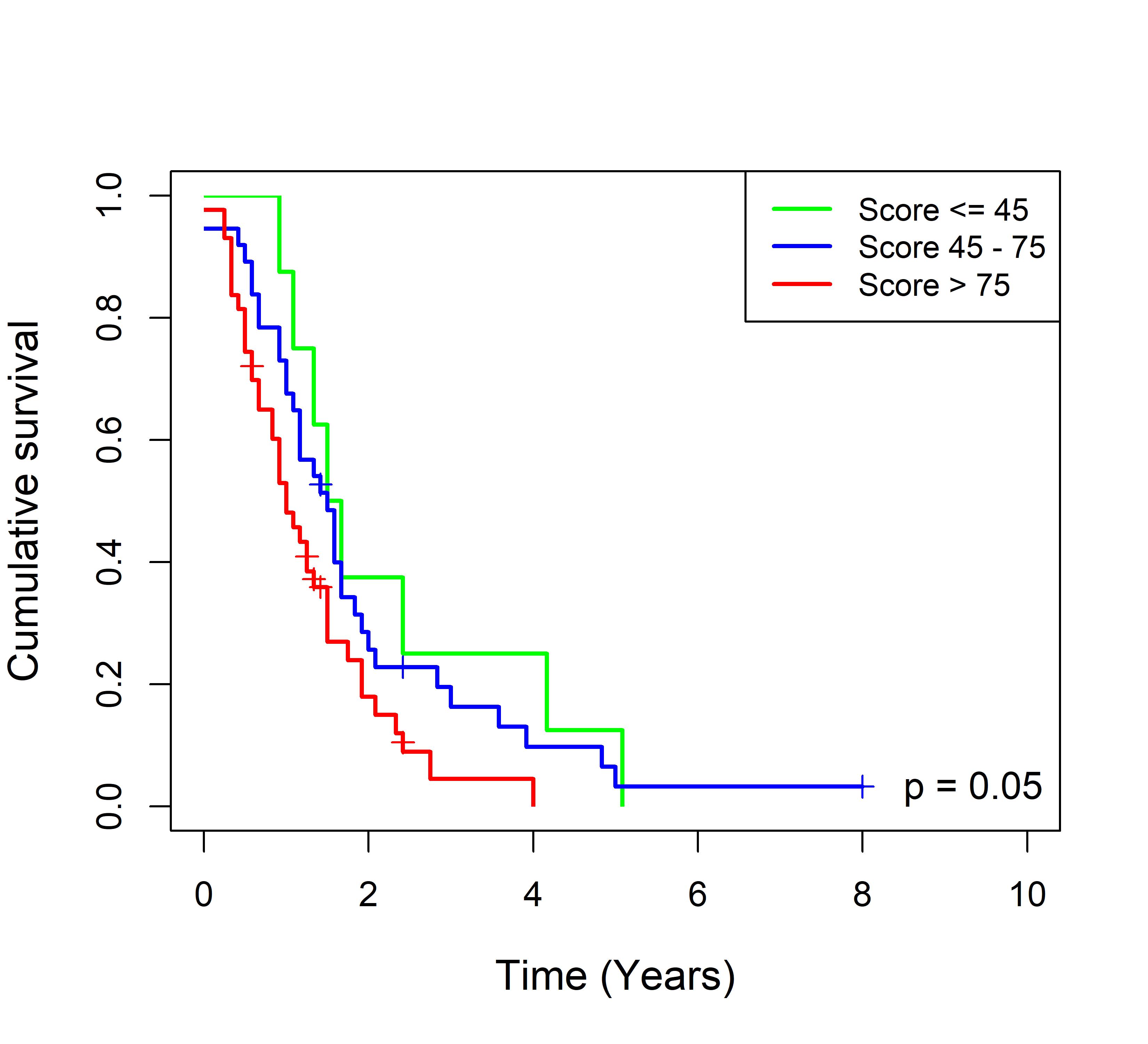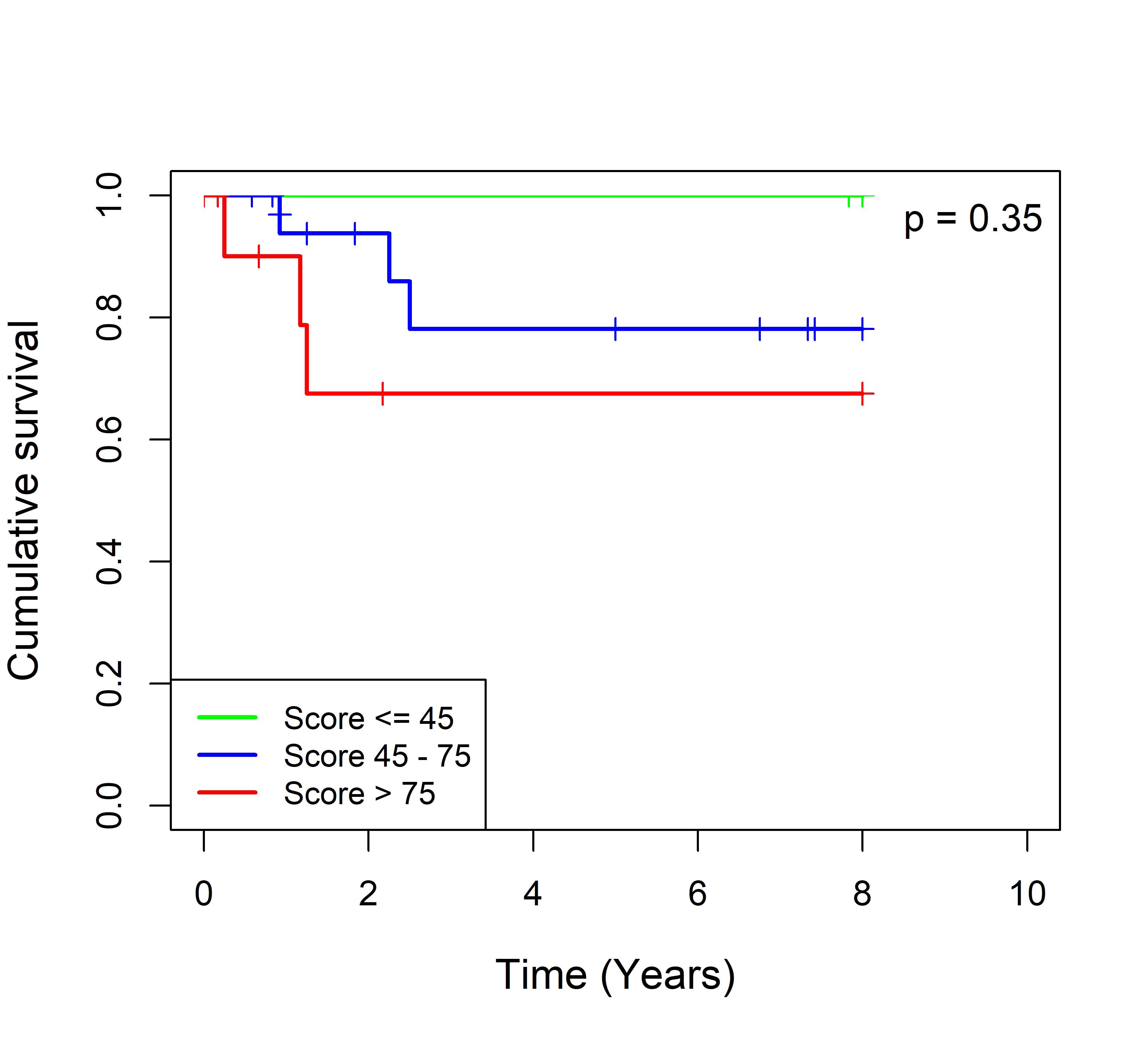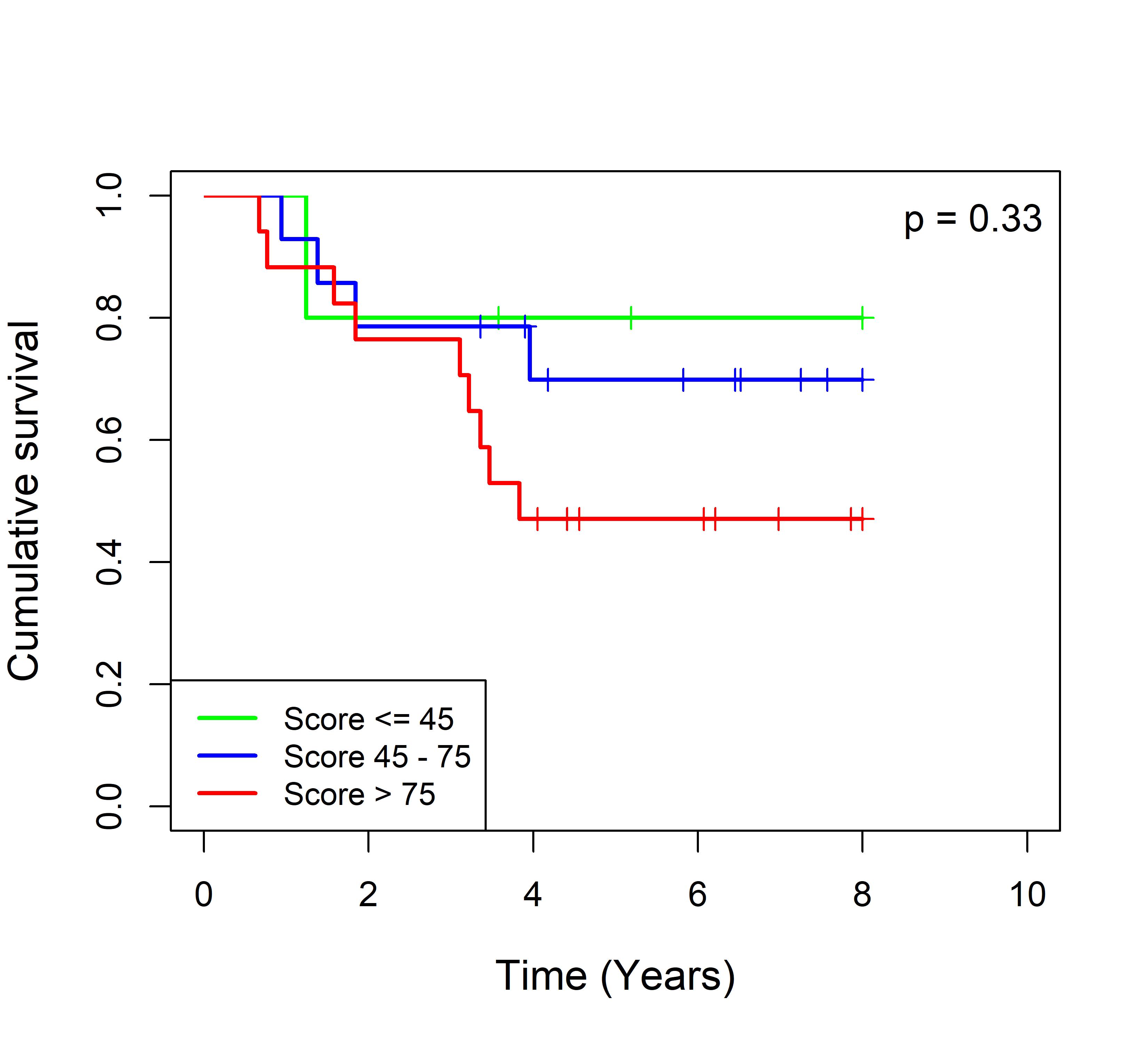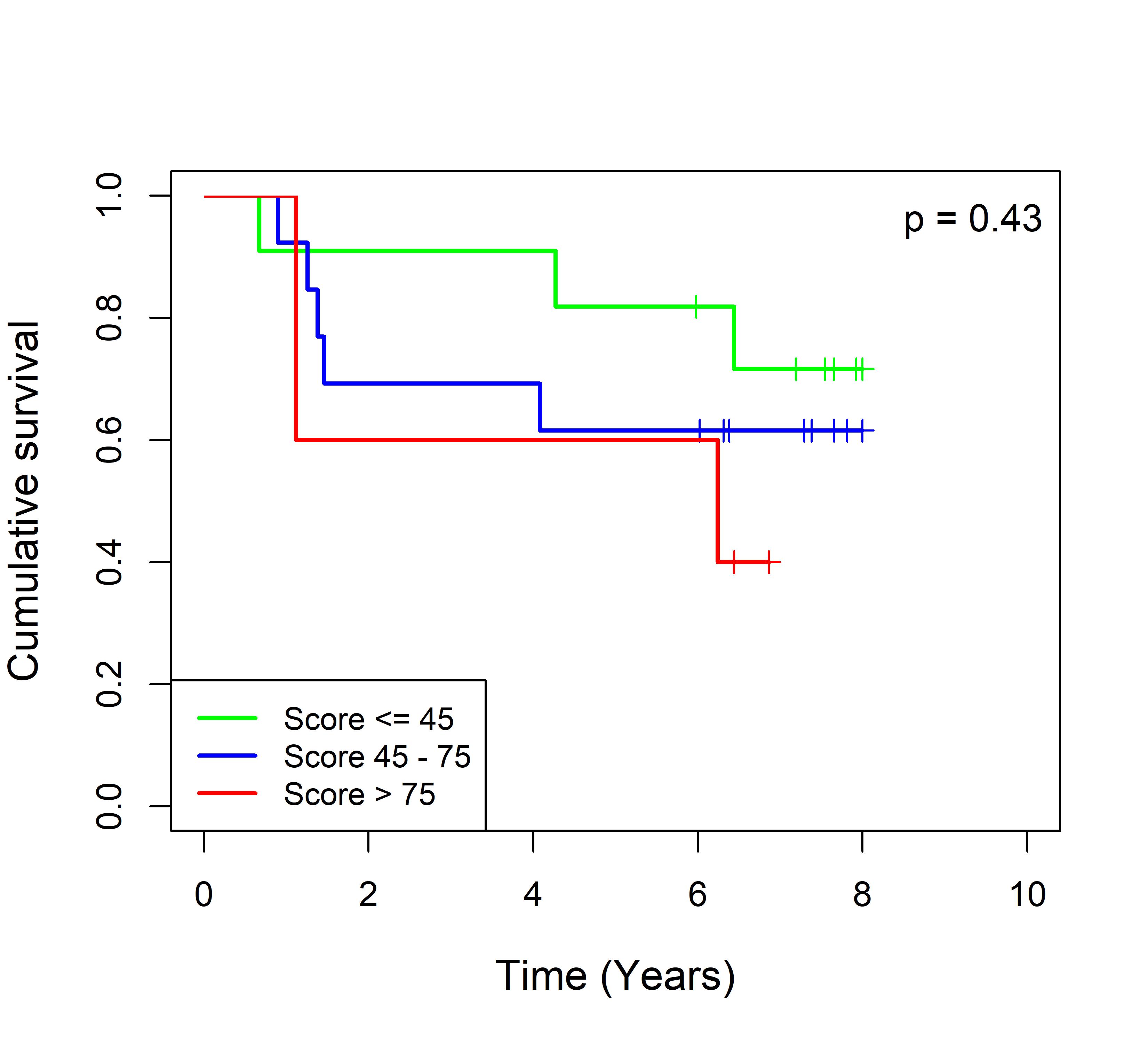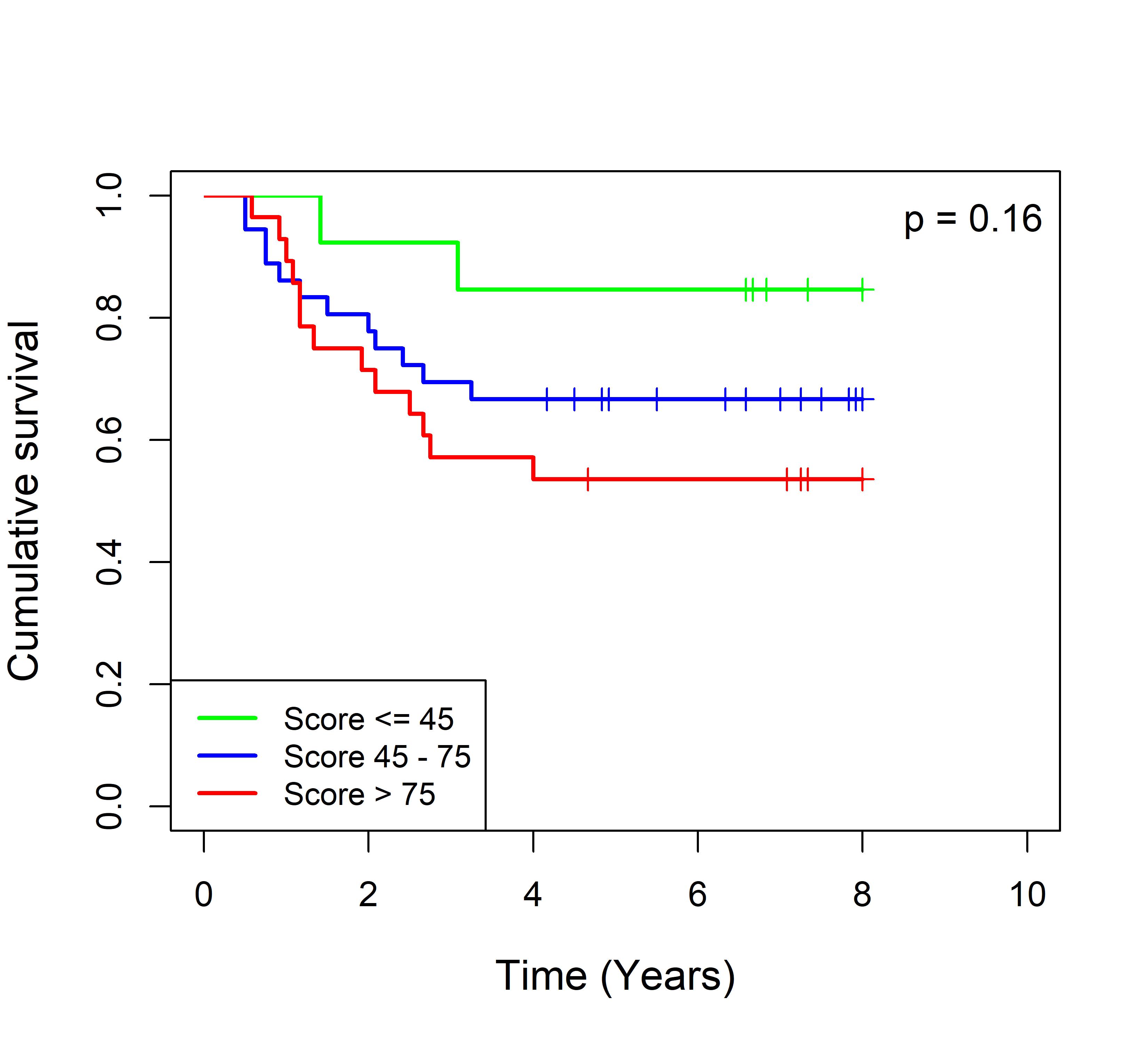 图 2. 多基因标签 Blue_panBC 预后评分与 22 个基于 TMO 的 ER 阴性乳腺癌队列患者生存的关联。每个 Kaplan-Meier 曲线图代表一个独立队列的分析结果。我们开发了一种算法,可独立于队列整体数据计算多基因标签 Blue_panBC 的预后评分,从而实现不同 TMO 芯片平台间乳腺癌样本评分的直接比较,并可对新增个体样本计算该标签的预后评分。所有样本根据预后评分分为三组:低(≤45)、中(45–75)和高(>75)。随后对这些组别的累积生存率进行比较。27 个非 TMO 乳腺癌队列的数据见图 3。