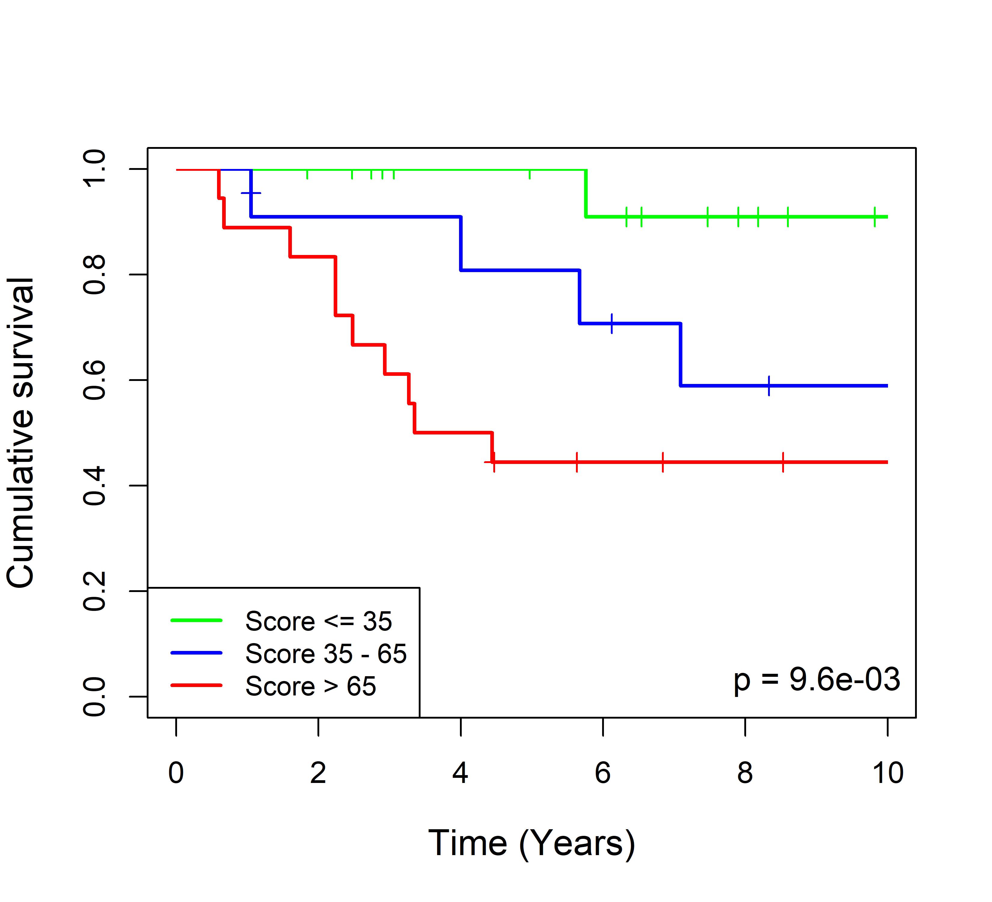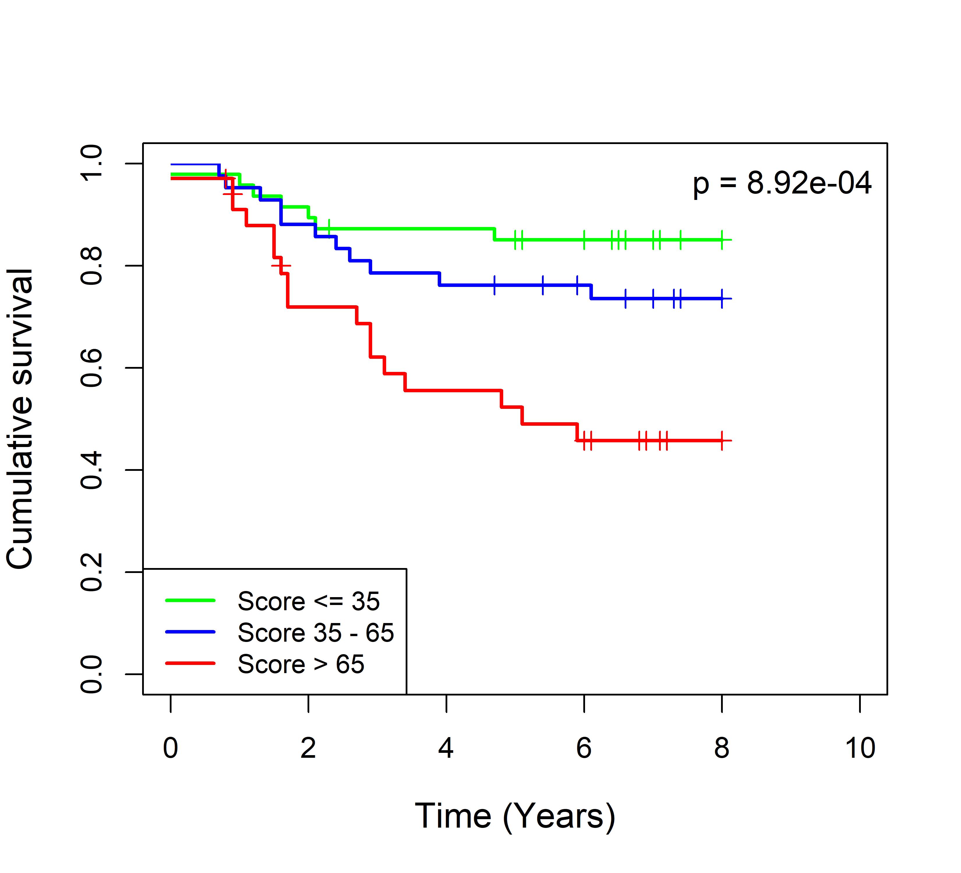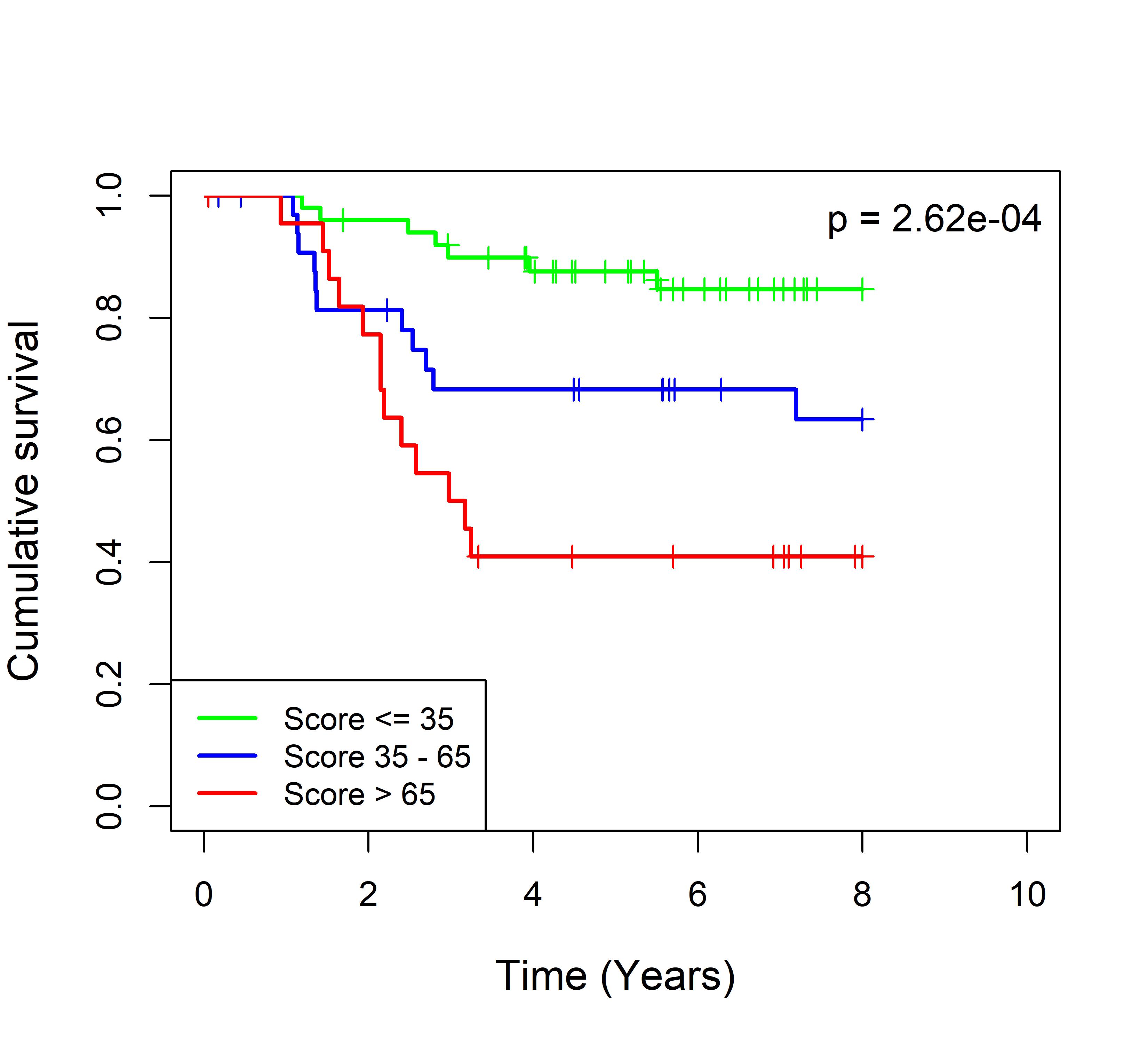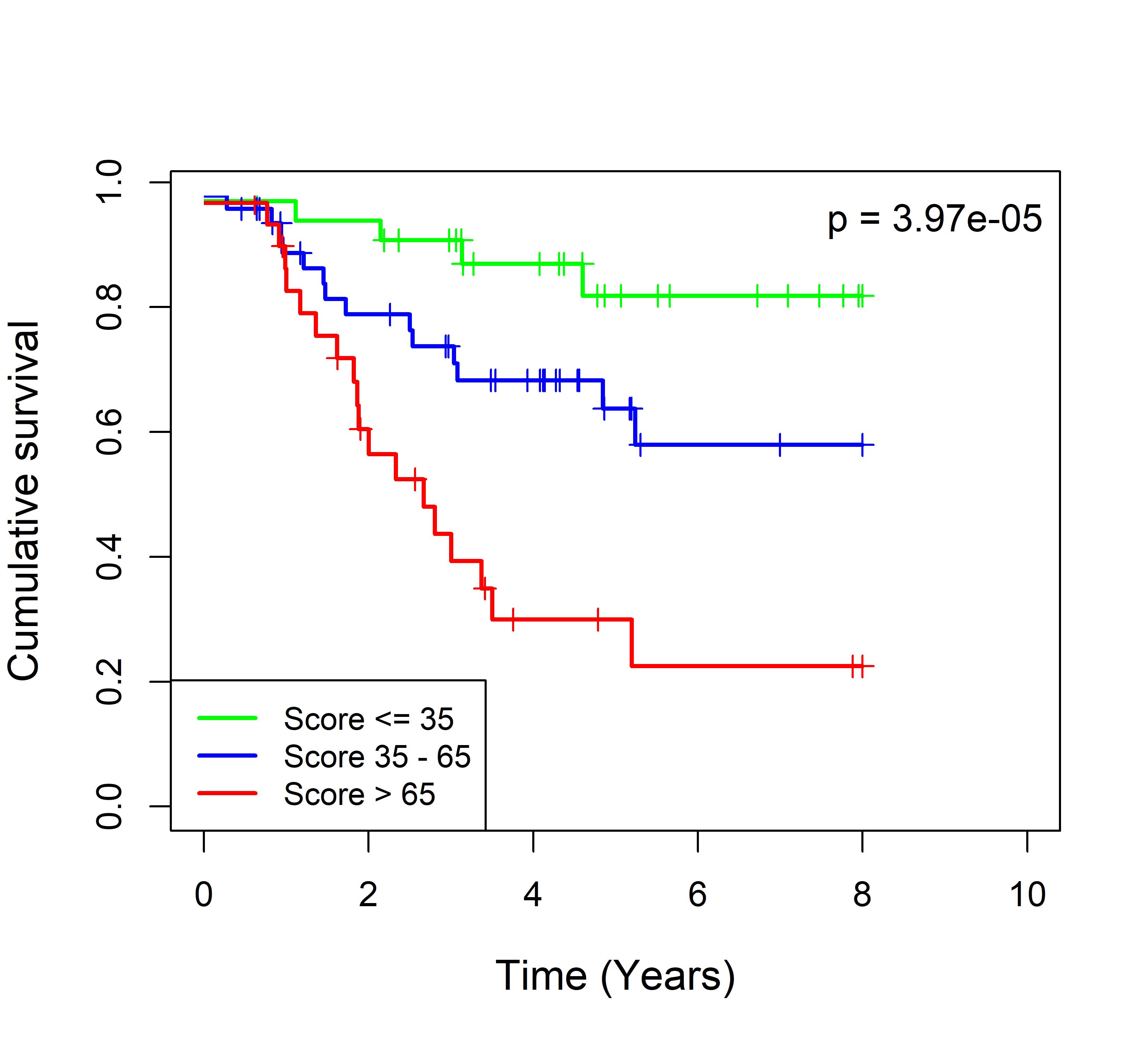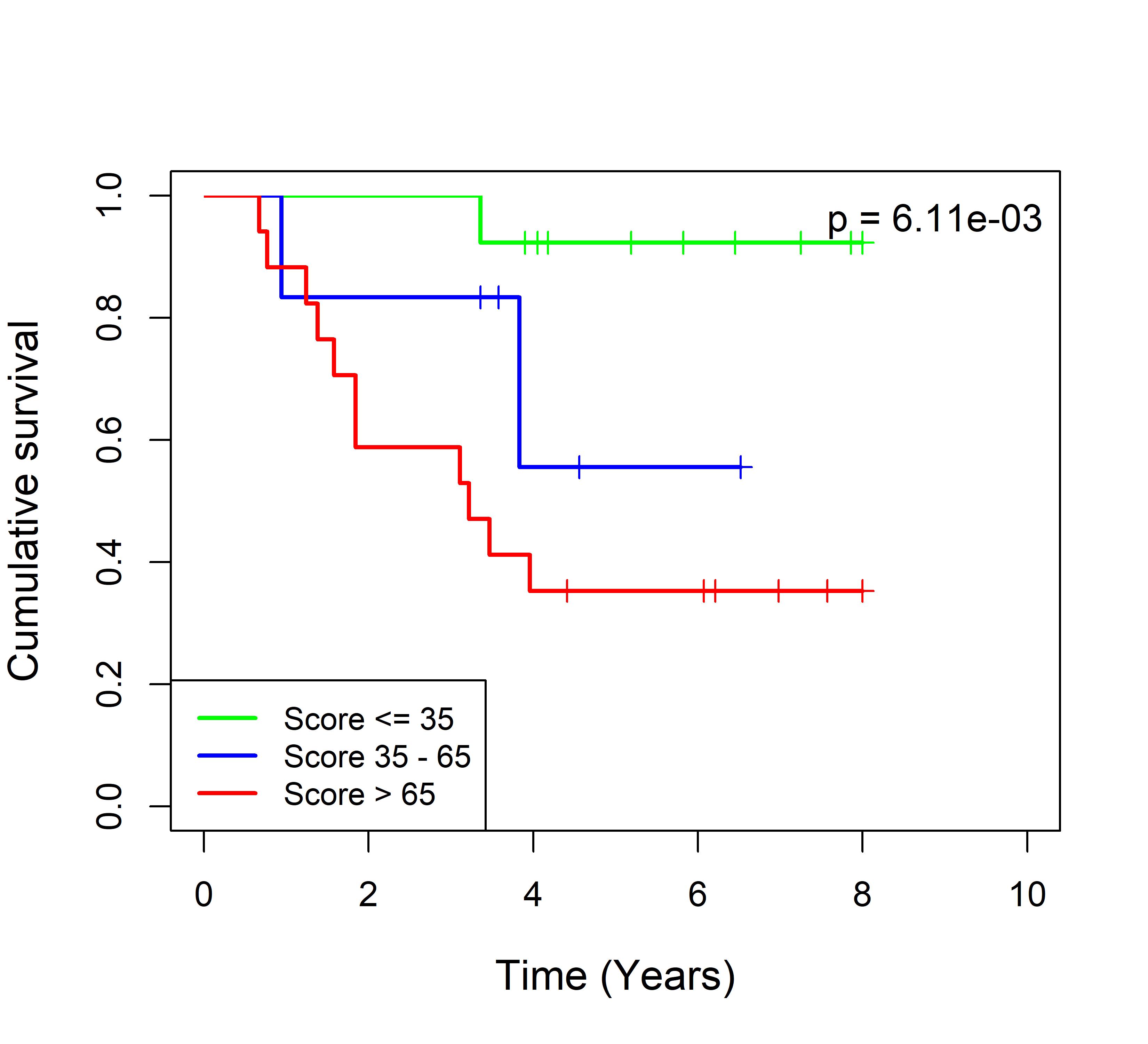 图 5. 多基因标签 Blue_TNBC 预后评分与 22 个基于 TMO 的 ER 阴性乳腺癌队列患者生存的关联。每个 Kaplan-Meier 曲线图代表一个独立队列的分析结果。我们开发了一种算法,可独立于队列整体数据计算多基因标签 Blue_panBC 的预后评分,从而实现不同 TMO 芯片平台间乳腺癌样本评分的直接比较,并可对新增个体样本计算该标签的预后评分。所有样本根据预后评分分为三组:低(≤35)、中(35–65)和高(>65)。随后对这些组别的累积生存率进行比较。27 个非 TMO 乳腺癌队列的数据见图 6。