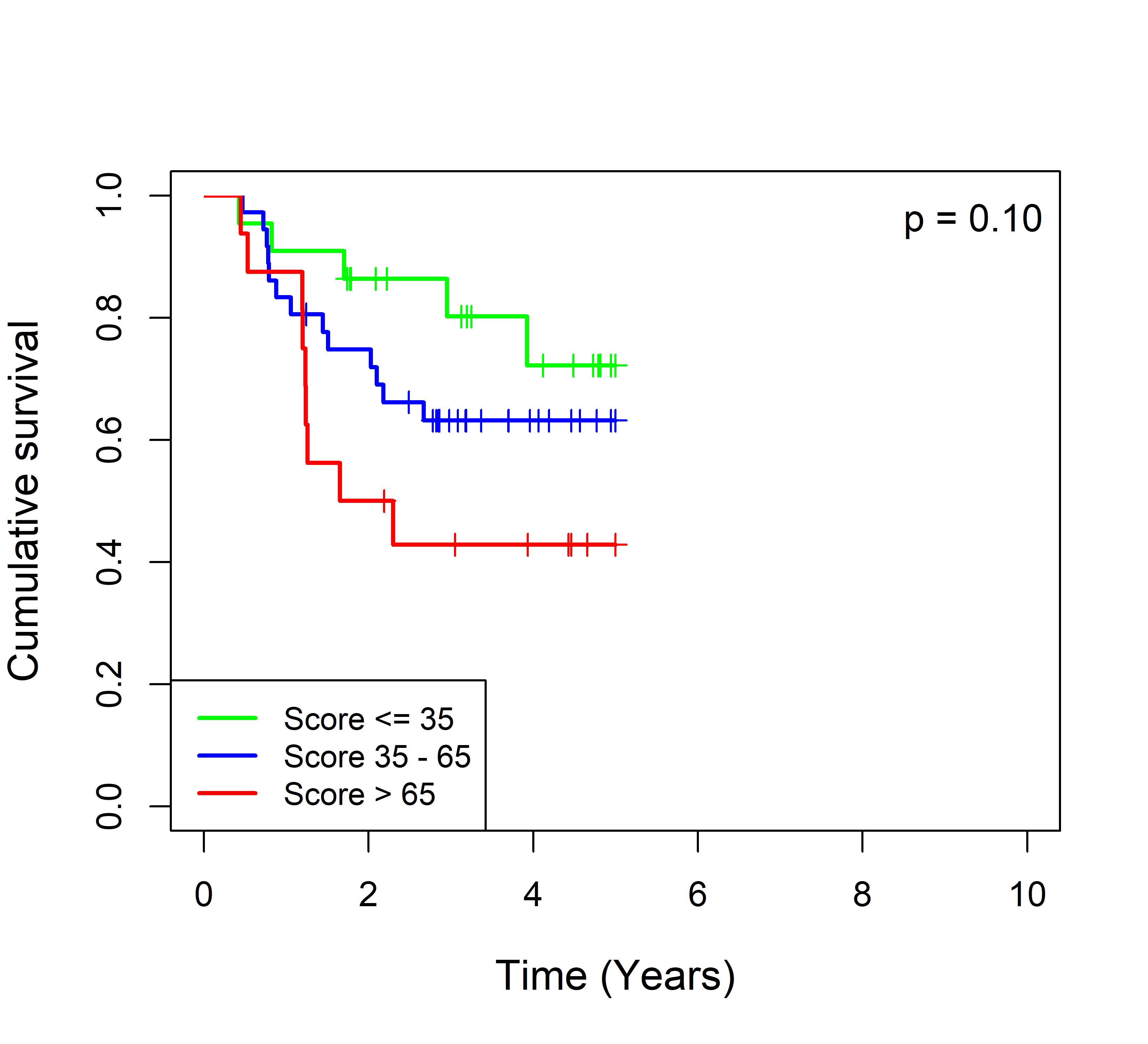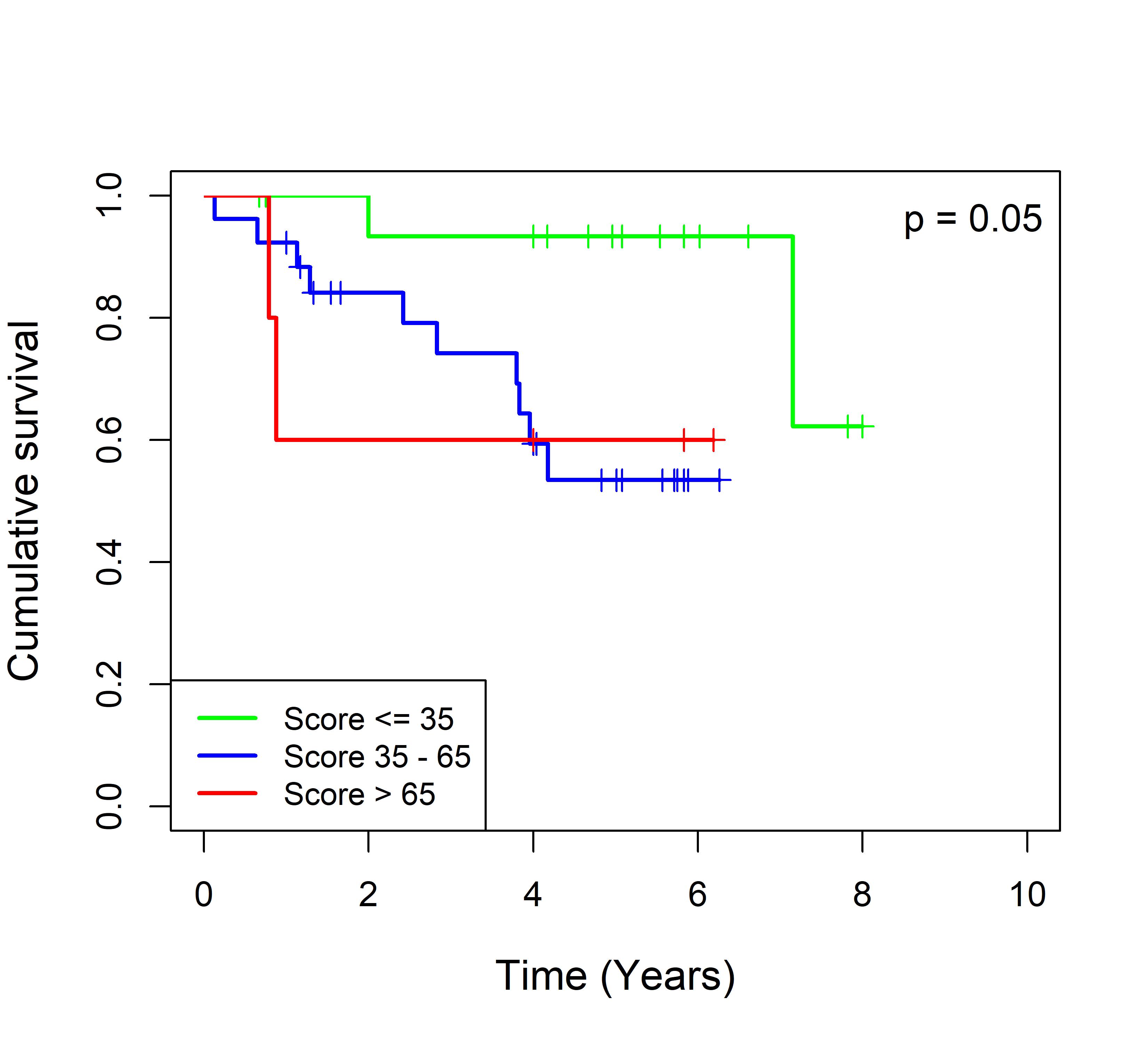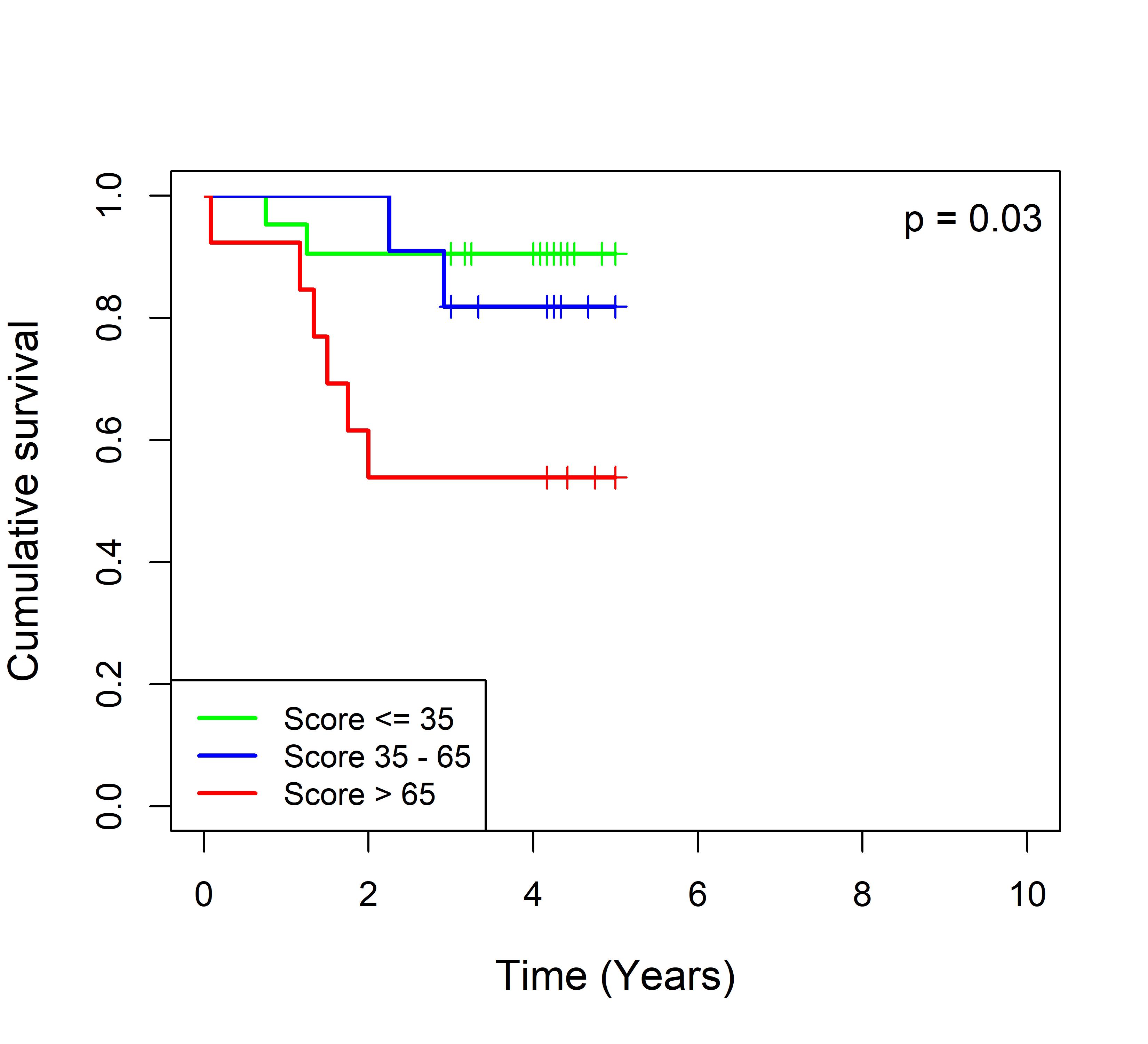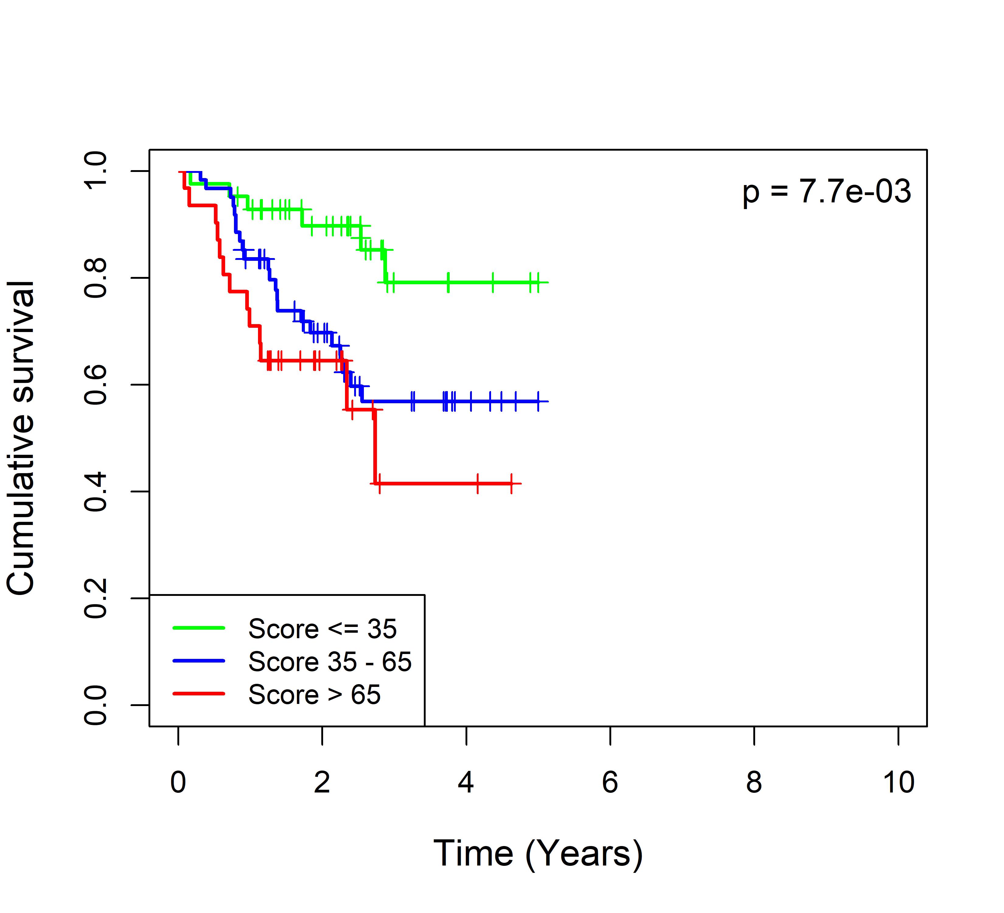 图 5. 多基因标签 Blue_TNBC 预后评分与 22 个基于 TMO 的 ER 阴性乳腺癌队列患者生存的关联。每个 Kaplan-Meier 曲线图代表一个独立队列的分析结果。我们开发了一种算法,可独立于队列整体数据计算多基因标签 Blue_panBC 的预后评分,从而实现不同 TMO 芯片平台间乳腺癌样本评分的直接比较,并可对新增个体样本计算该标签的预后评分。所有样本根据预后评分分为三组:低(≤35)、中(35–65)和高(>65)。随后对这些组别的累积生存率进行比较。27 个非 TMO 乳腺癌队列的数据见图 6。