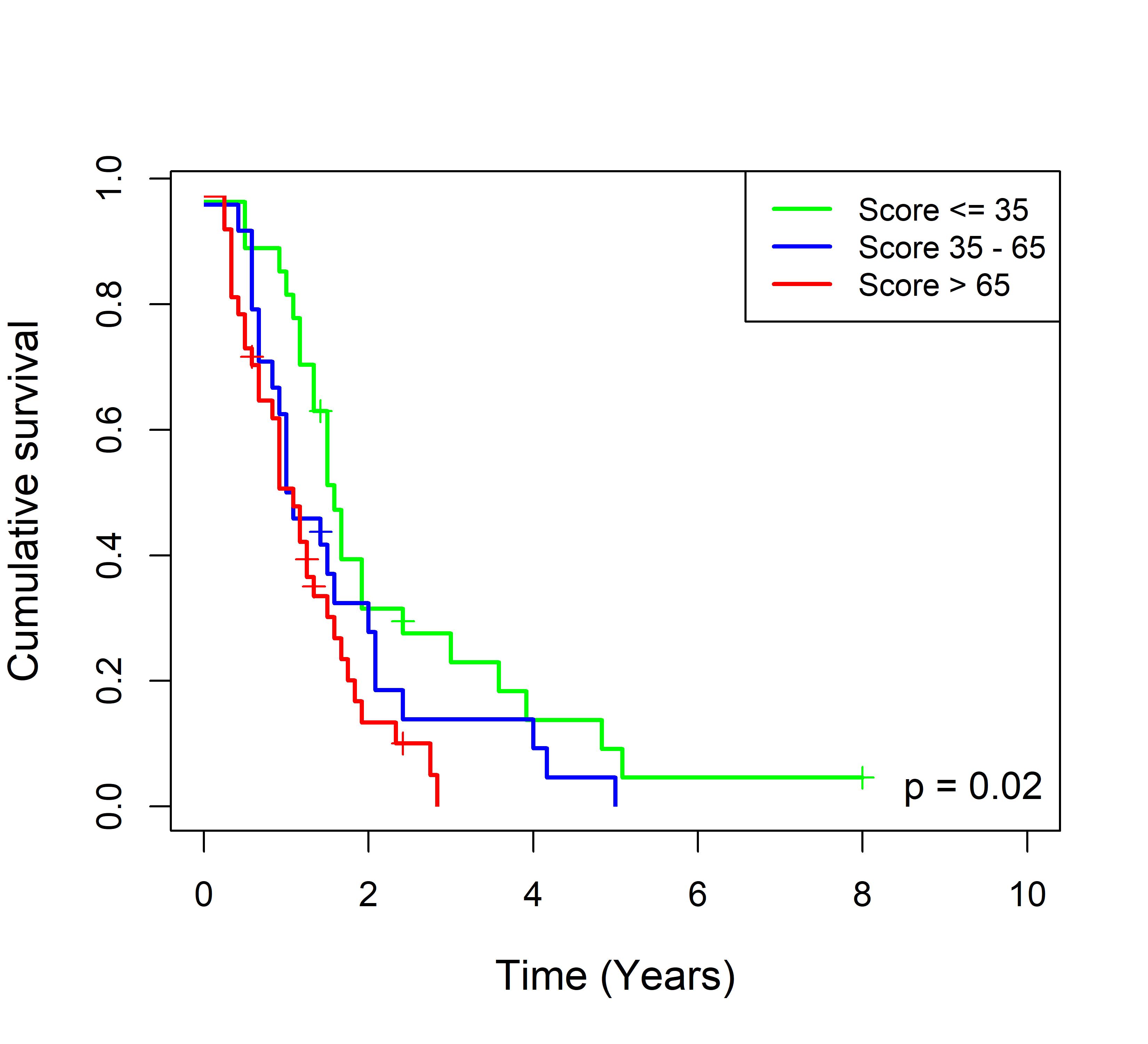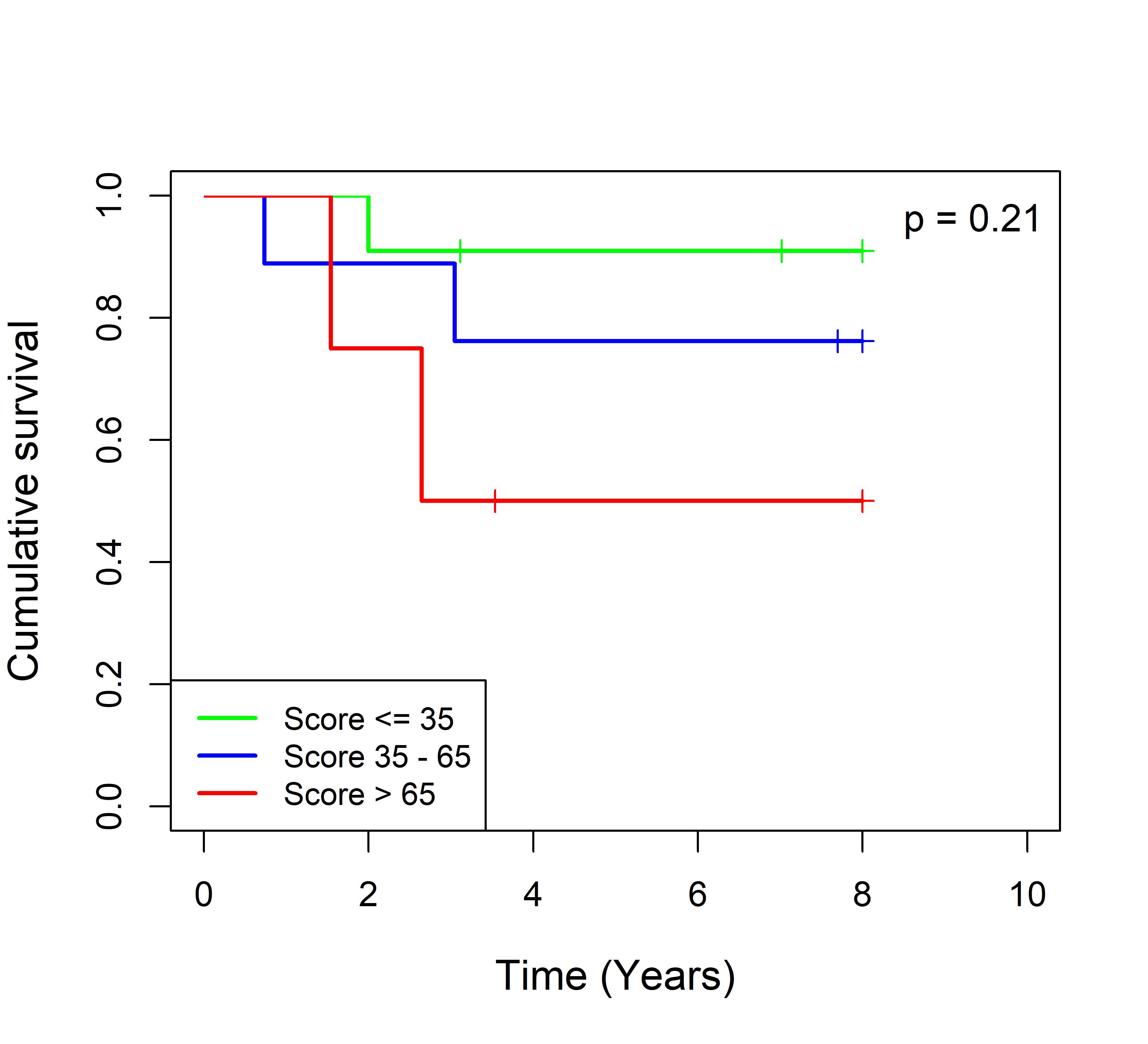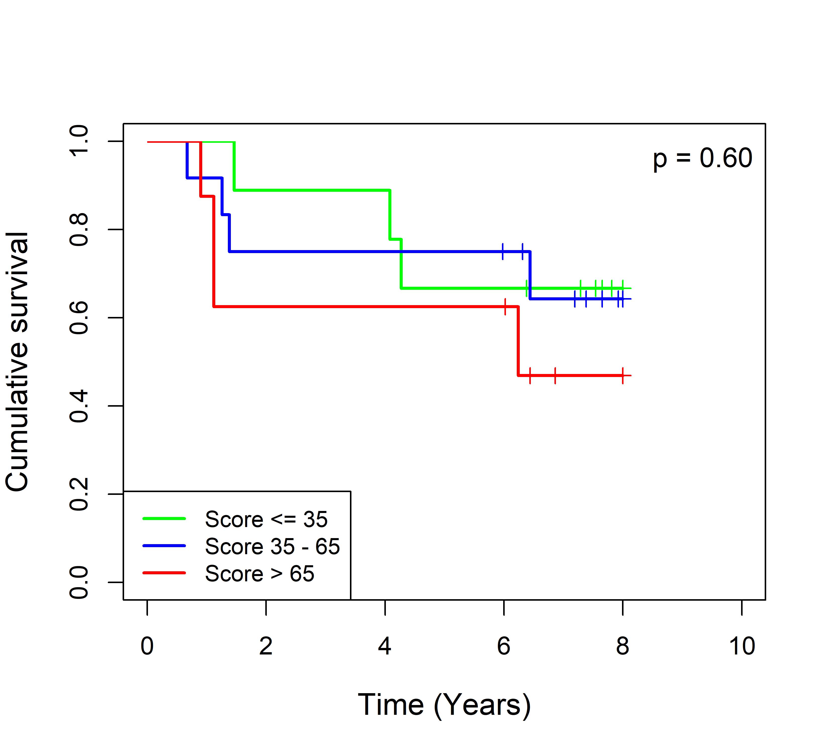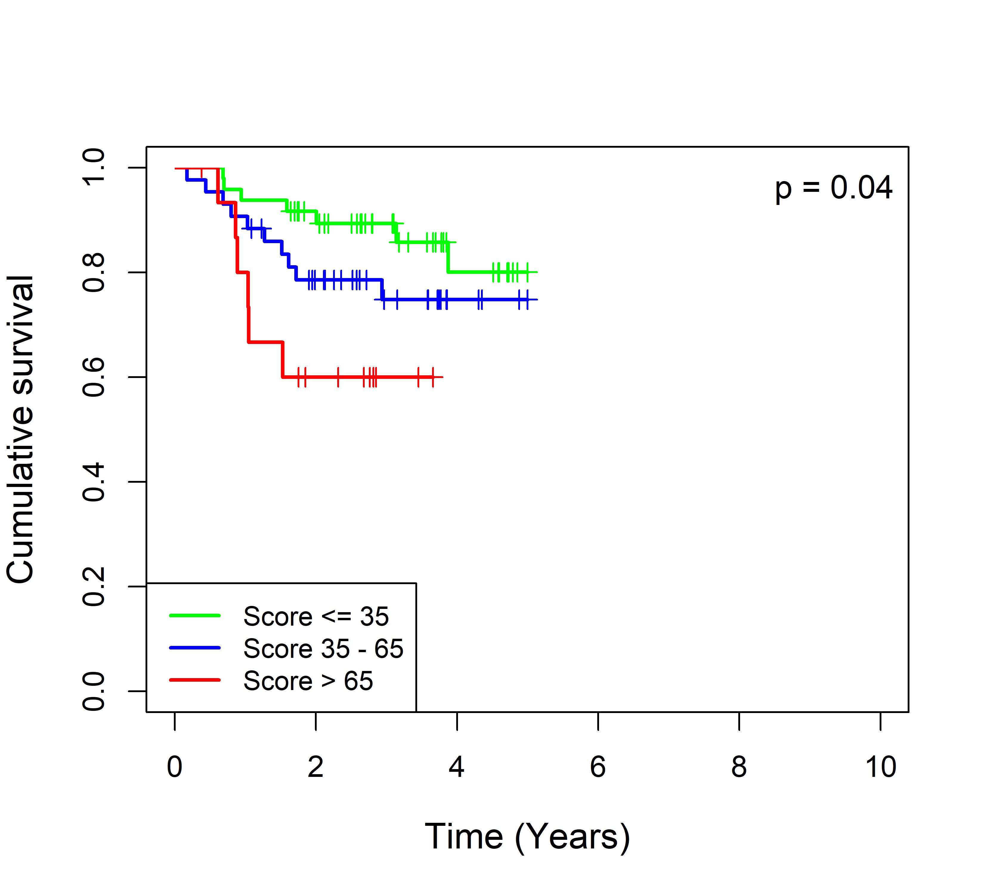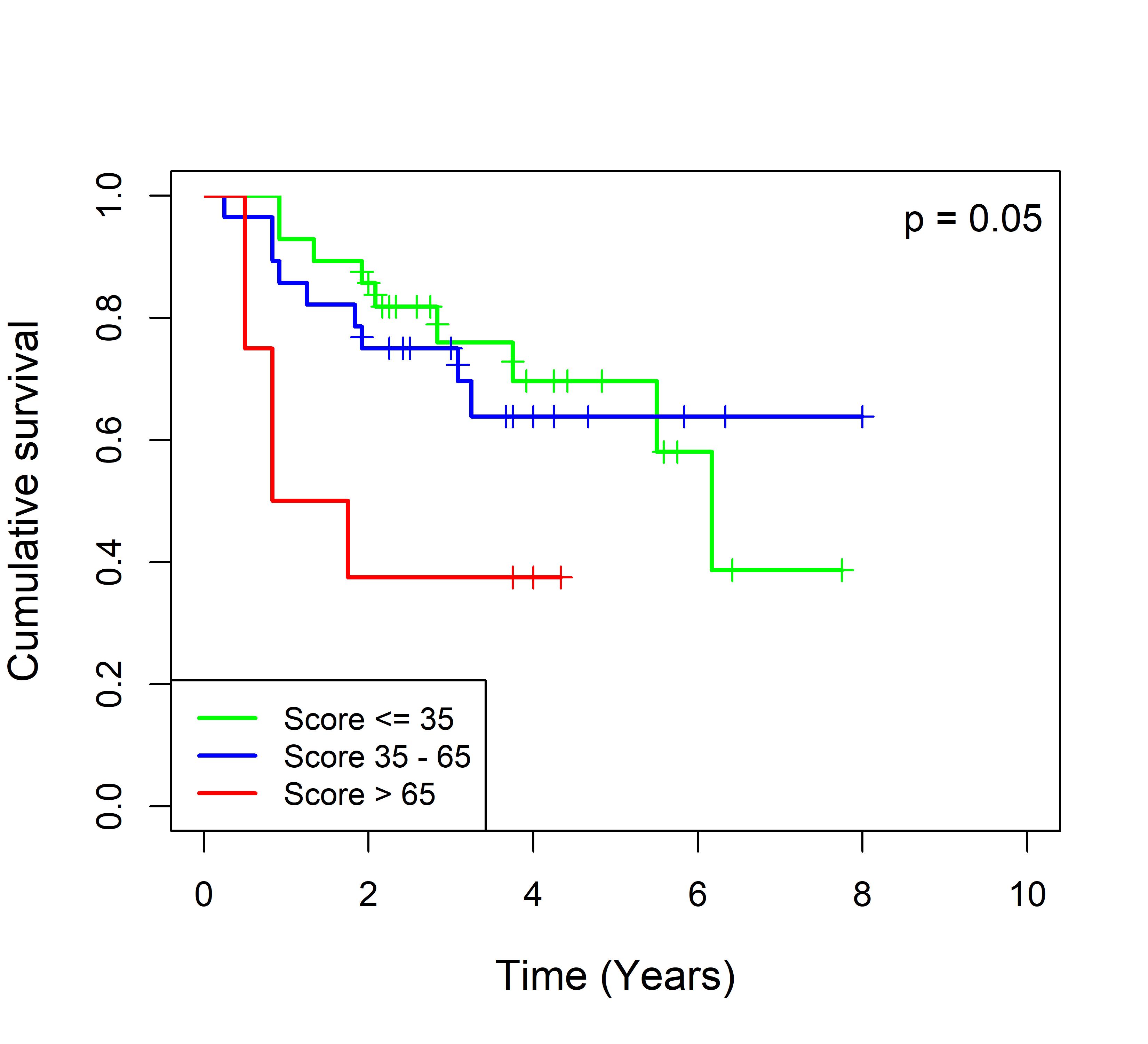 图 5. 多基因标签 Blue_TNBC 预后评分与 22 个基于 TMO 的 ER 阴性乳腺癌队列患者生存的关联。每个 Kaplan-Meier 曲线图代表一个独立队列的分析结果。我们开发了一种算法,可独立于队列整体数据计算多基因标签 Blue_panBC 的预后评分,从而实现不同 TMO 芯片平台间乳腺癌样本评分的直接比较,并可对新增个体样本计算该标签的预后评分。所有样本根据预后评分分为三组:低(≤35)、中(35–65)和高(>65)。随后对这些组别的累积生存率进行比较。27 个非 TMO 乳腺癌队列的数据见图 6。