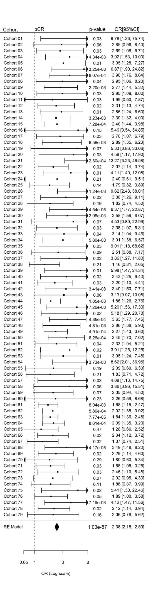 图 1. 多基因标签 Blue_response 预后评分与乳腺癌对新辅助化疗病理完全缓解的关联。Logistic 回归分析基于 79 个独立乳腺癌队列进行。