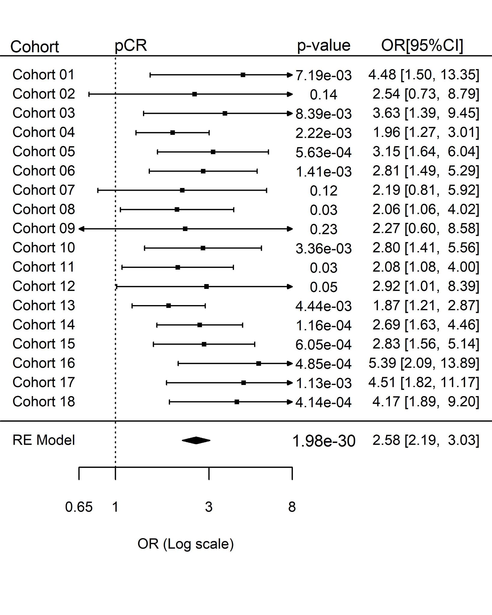 图 4. 多基因标签 Blue_response 预后评分与 HER2 阳性乳腺癌患者在化疗联合抗 HER2 靶向治疗中的病理完全缓解率的关联。Logistic 回归分析基于 18 个独立队列进行。